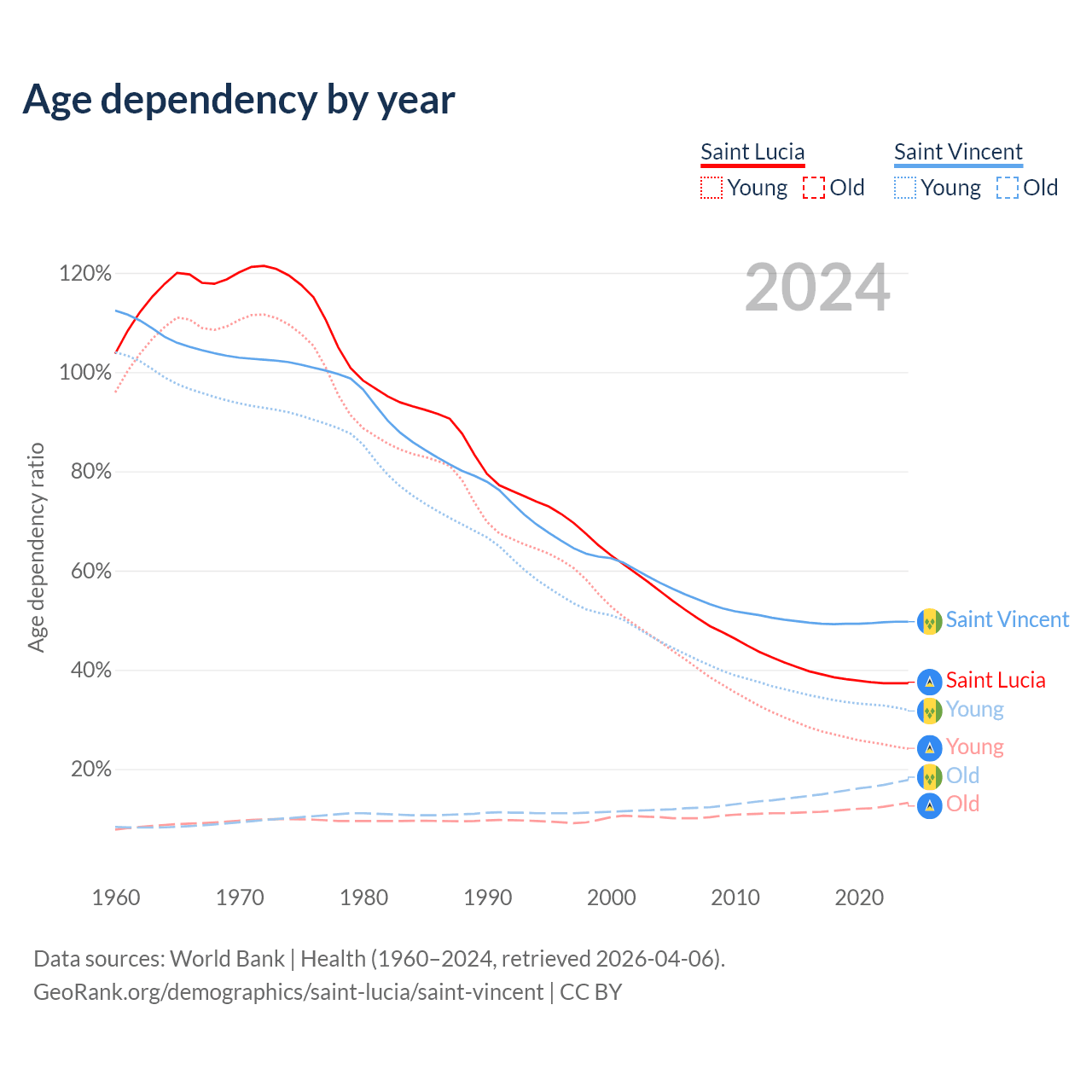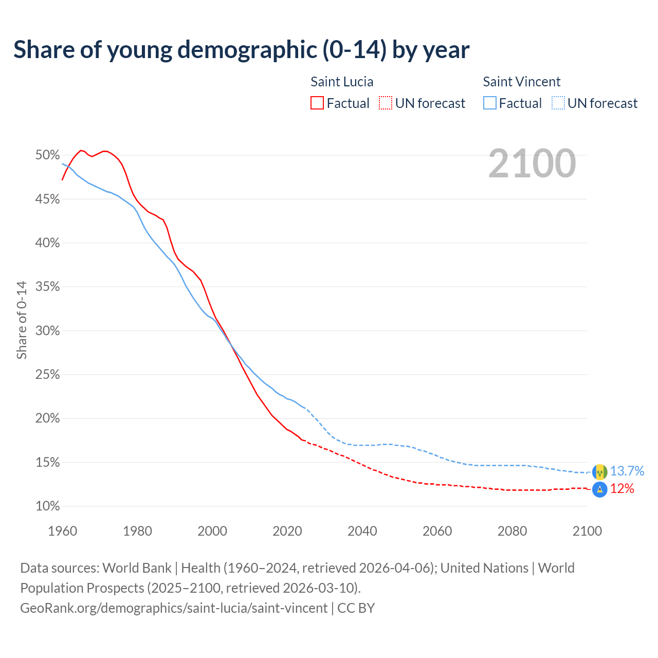 - The share of young demographic (0-15 years old) in Saint Lucia is 17.5% vs 21.3% in Saint Vincent.