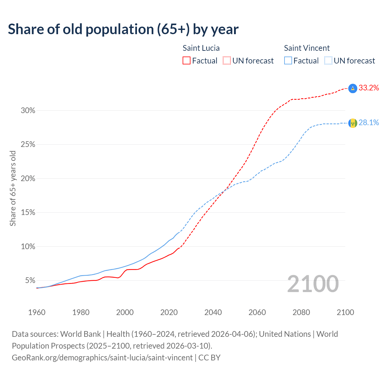 The share of older people aged 65 and over is 9.62% in Saint Lucia and 11.9% in Saint Vincent. Life expectancy in Saint Lucia compared to Saint Vincent .
