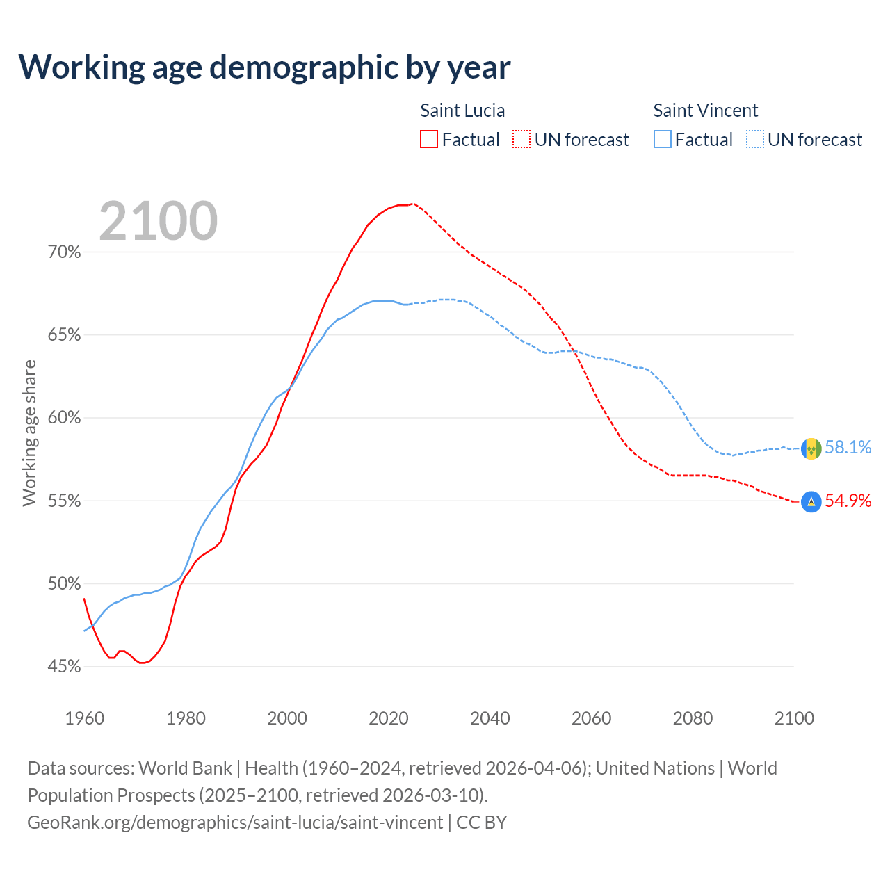 - Saint Lucia has 132K working age adults (aged 15-64) vs 66.3K in Saint Vincent.