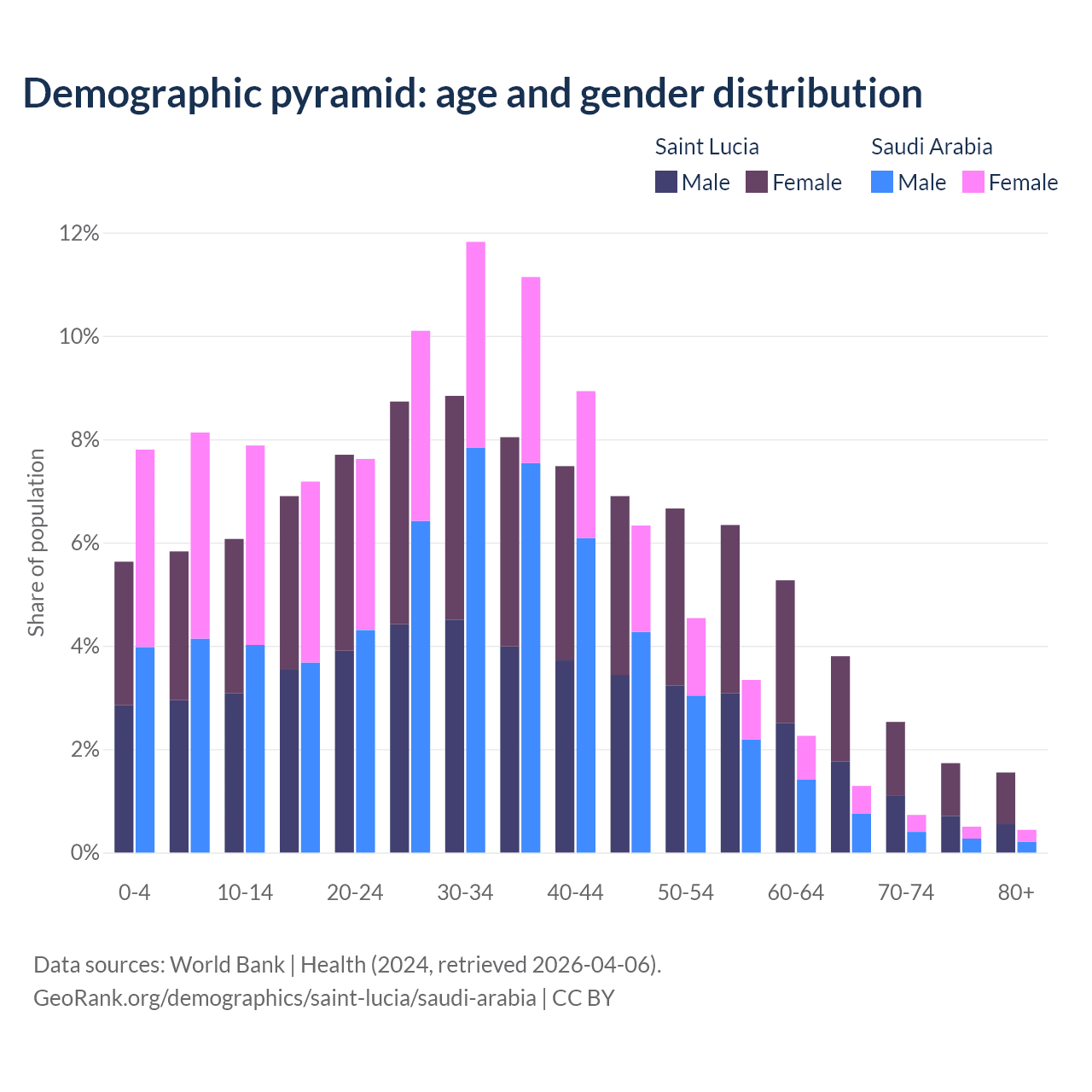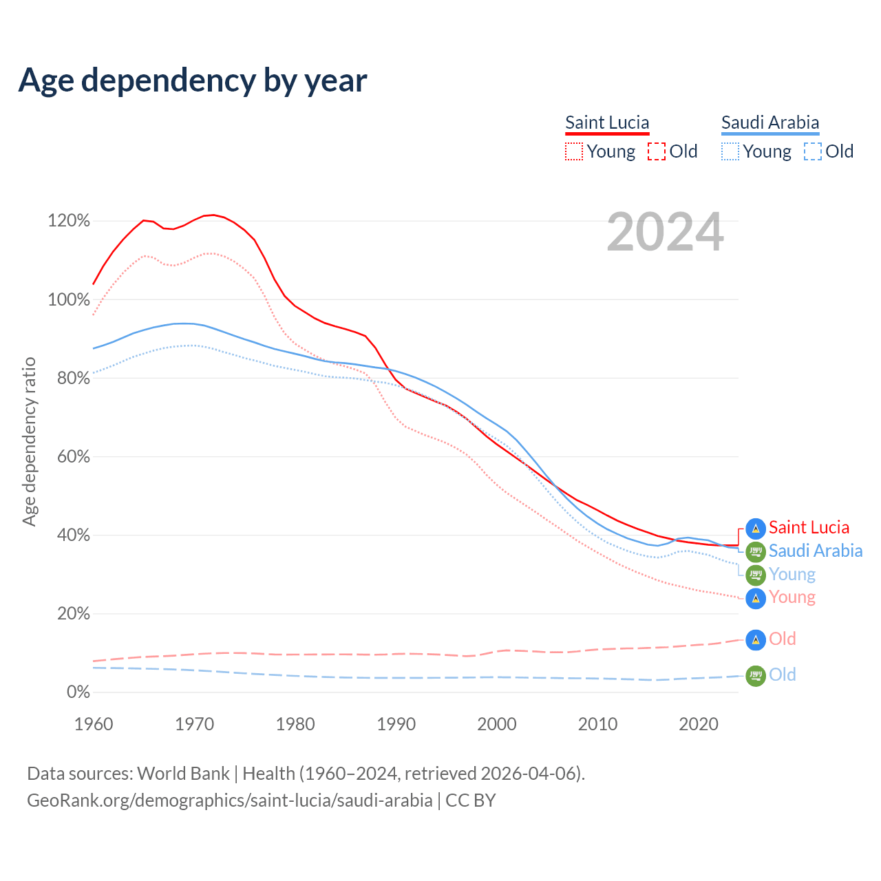 - Saint Lucia is ranked 74/196 by median age (oldest to youngest) vs 98/196 for Saudi Arabia.