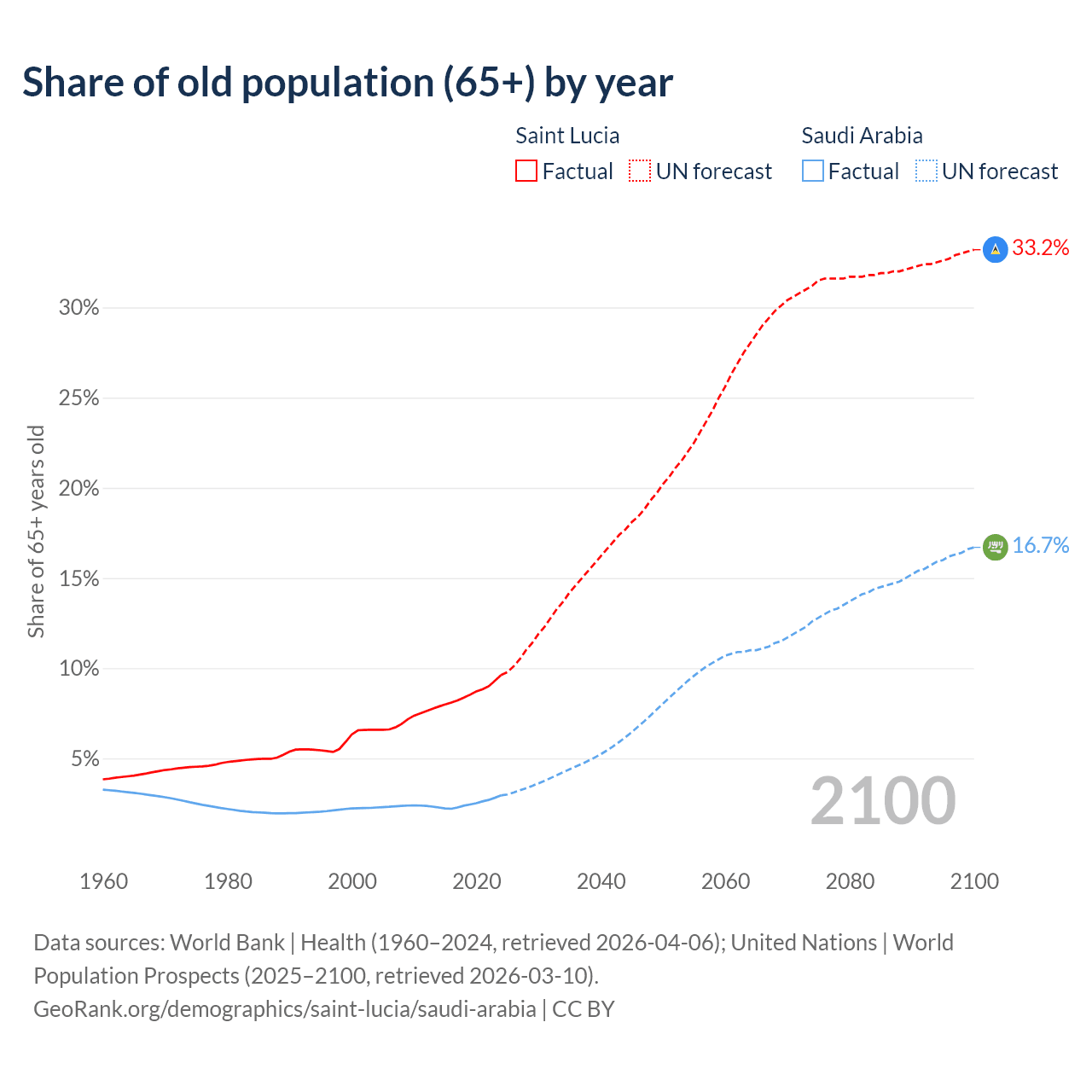 - The share of old-age demographic (65+) in Saint Lucia is 9.62% vs 2.95% in Saudi Arabia.