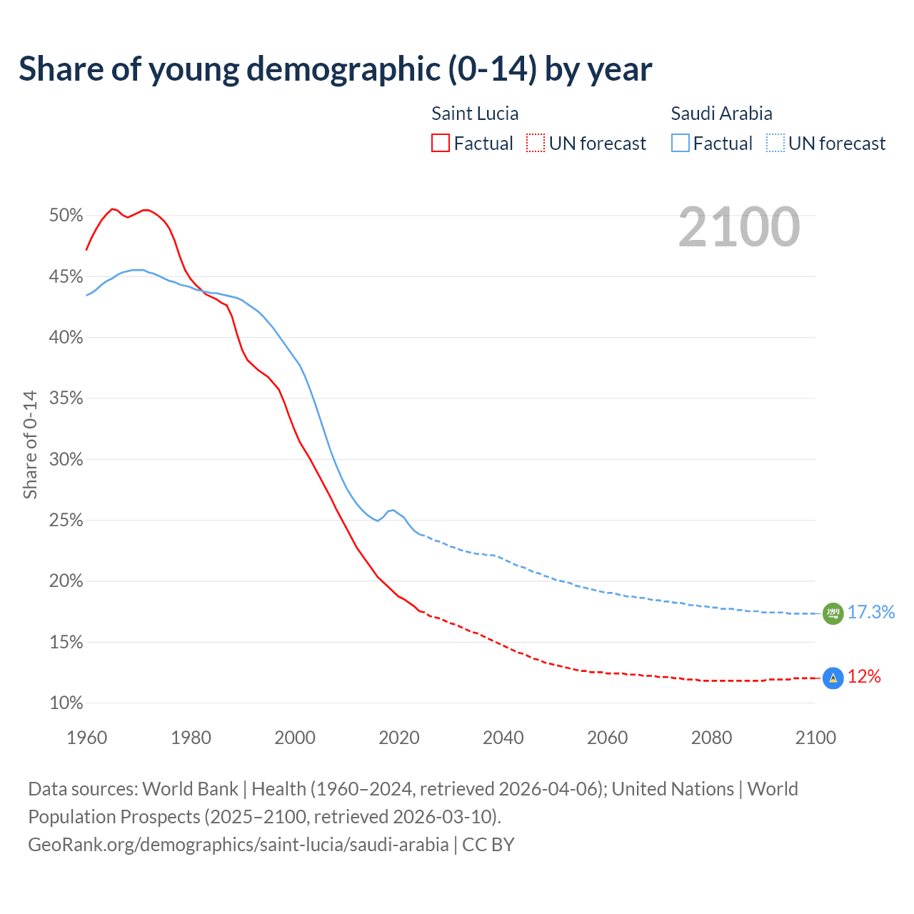 - The share of young demographic (0-15 years old) in Saint Lucia is 17.5% vs 23.8% in Saudi Arabia.