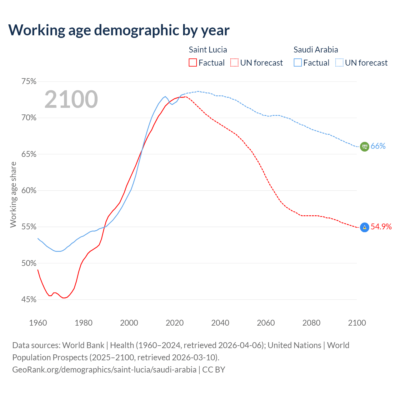 - Saint Lucia has 132K working age adults (aged 15-64) vs 26.9M in Saudi Arabia.
