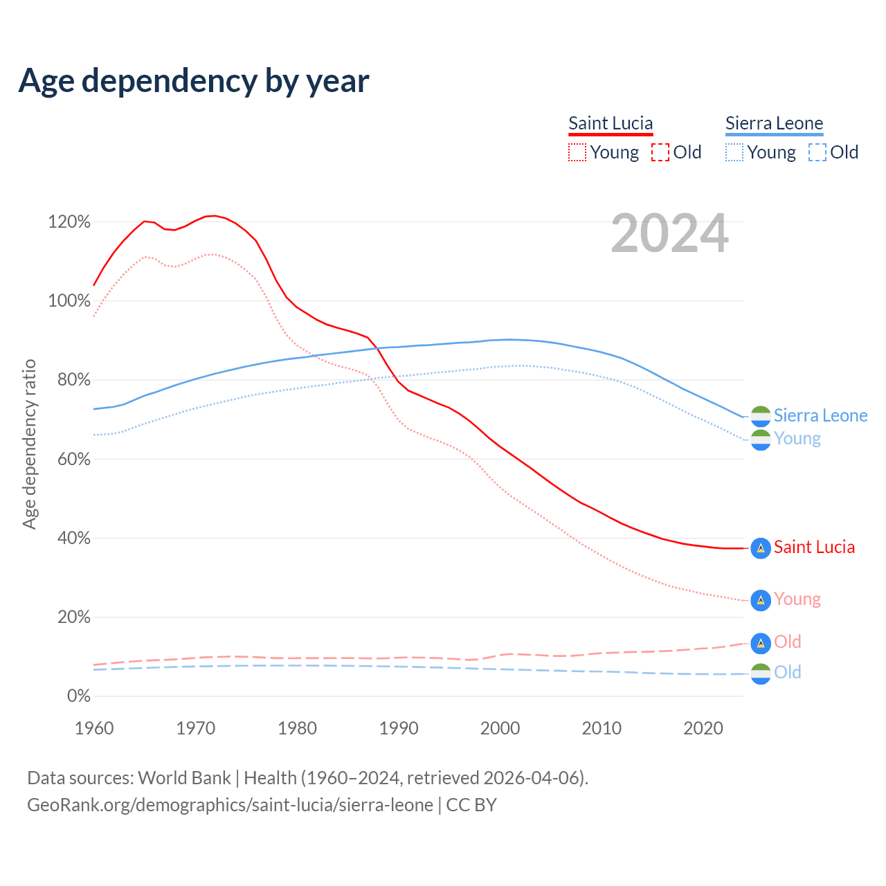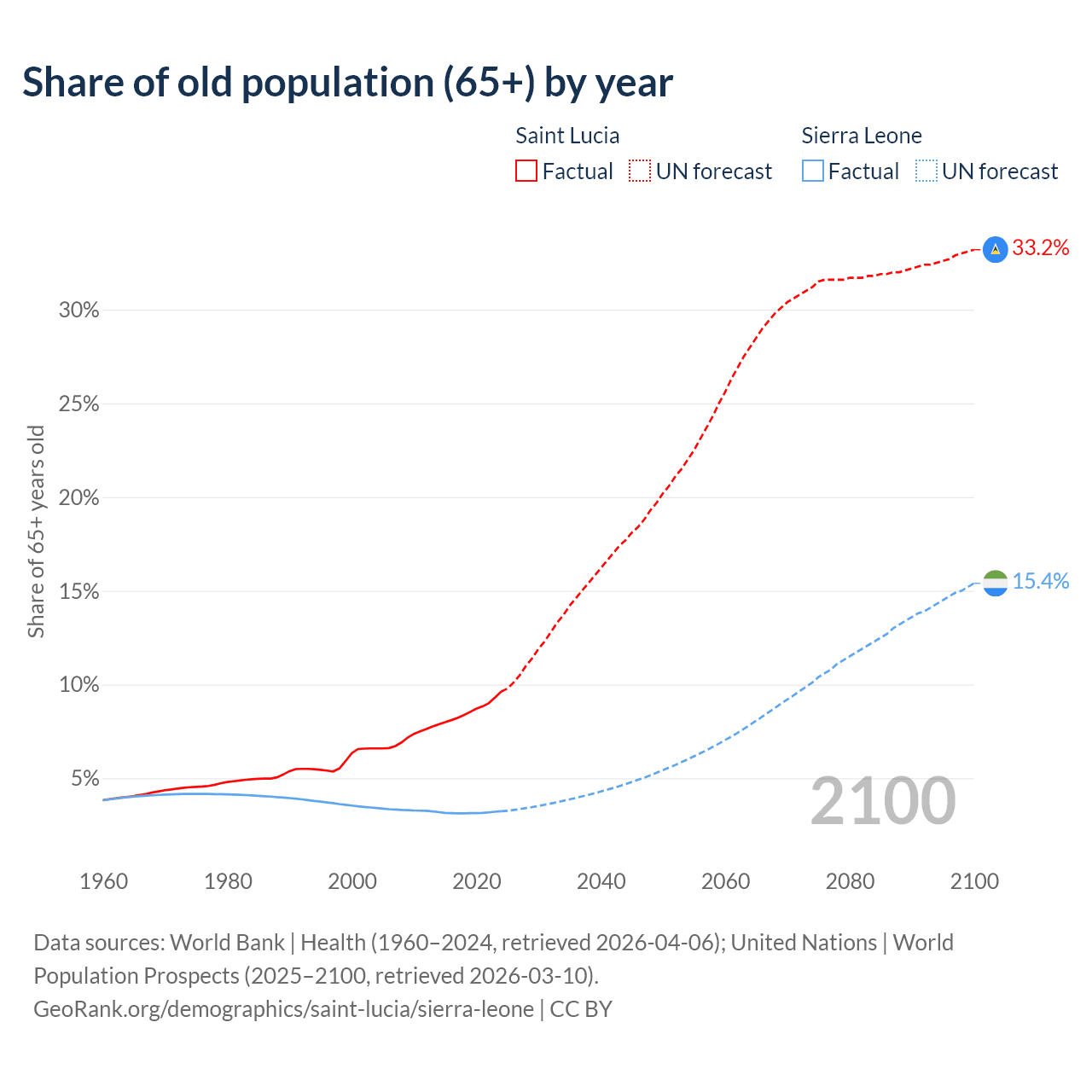 - The share of old-age demographic (65+) in Saint Lucia is 9.62% vs 3.24% in Sierra Leone.