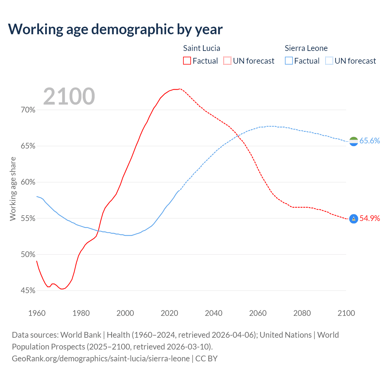 - Saint Lucia has 132K working age adults (aged 15-64) vs 5.31M in Sierra Leone.