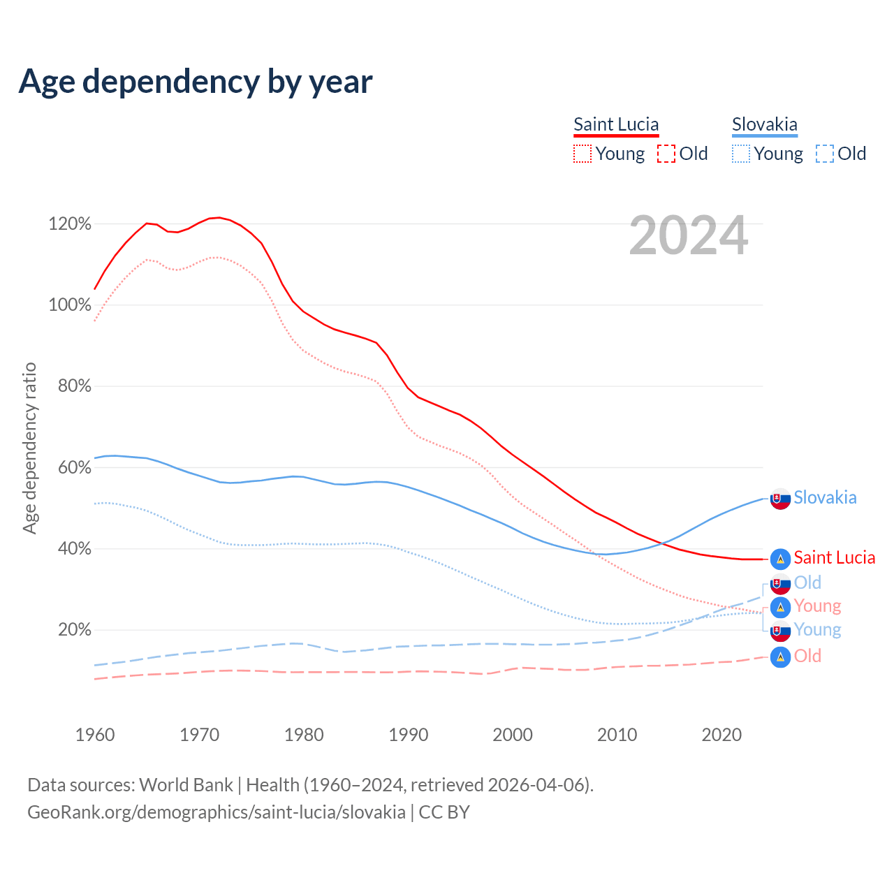 - The share of old-age demographic (65+) in Saint Lucia is 9.62% vs 18.5% in Slovakia.