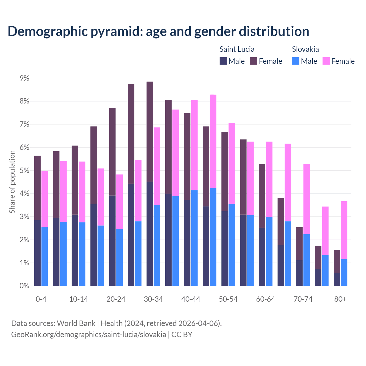 - The share of young demographic (0-15 years old) in Saint Lucia is 17.5% vs 15.8% in Slovakia.