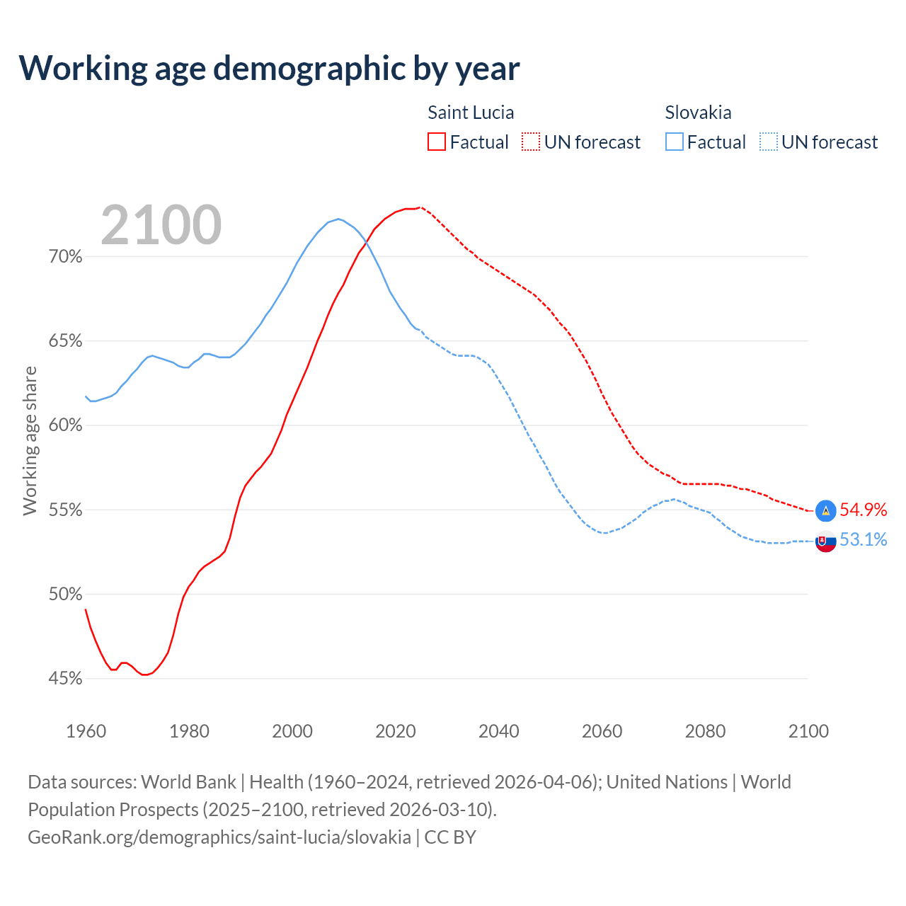 - Saint Lucia has 132K working age adults (aged 15-64) vs 3.52M in Slovakia.