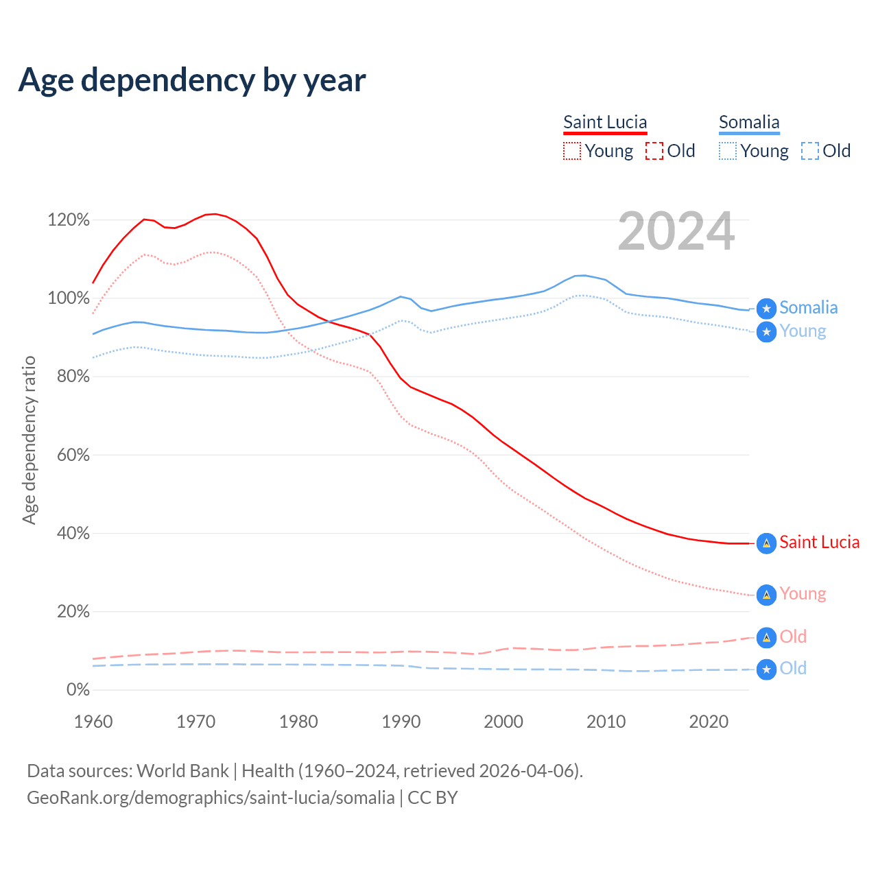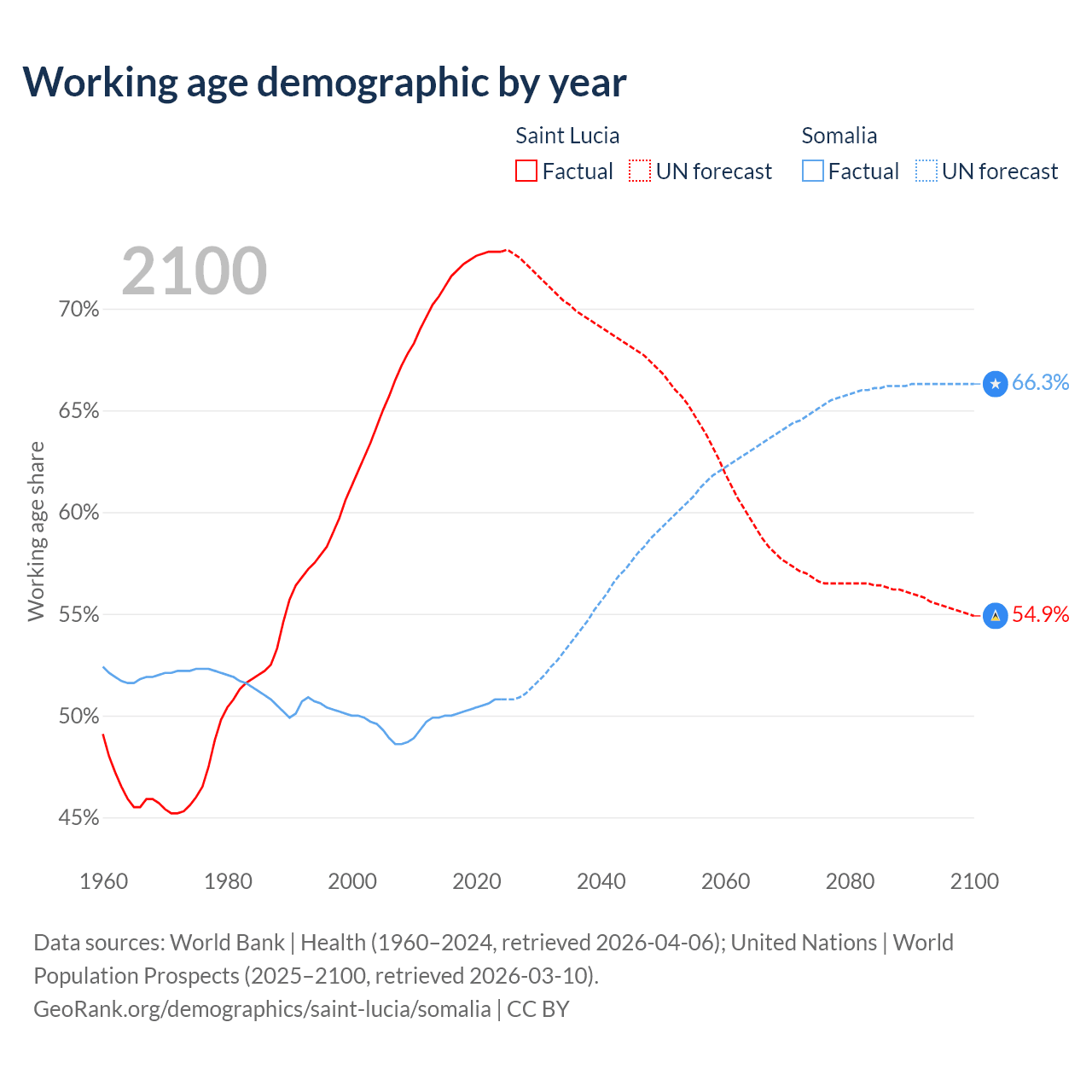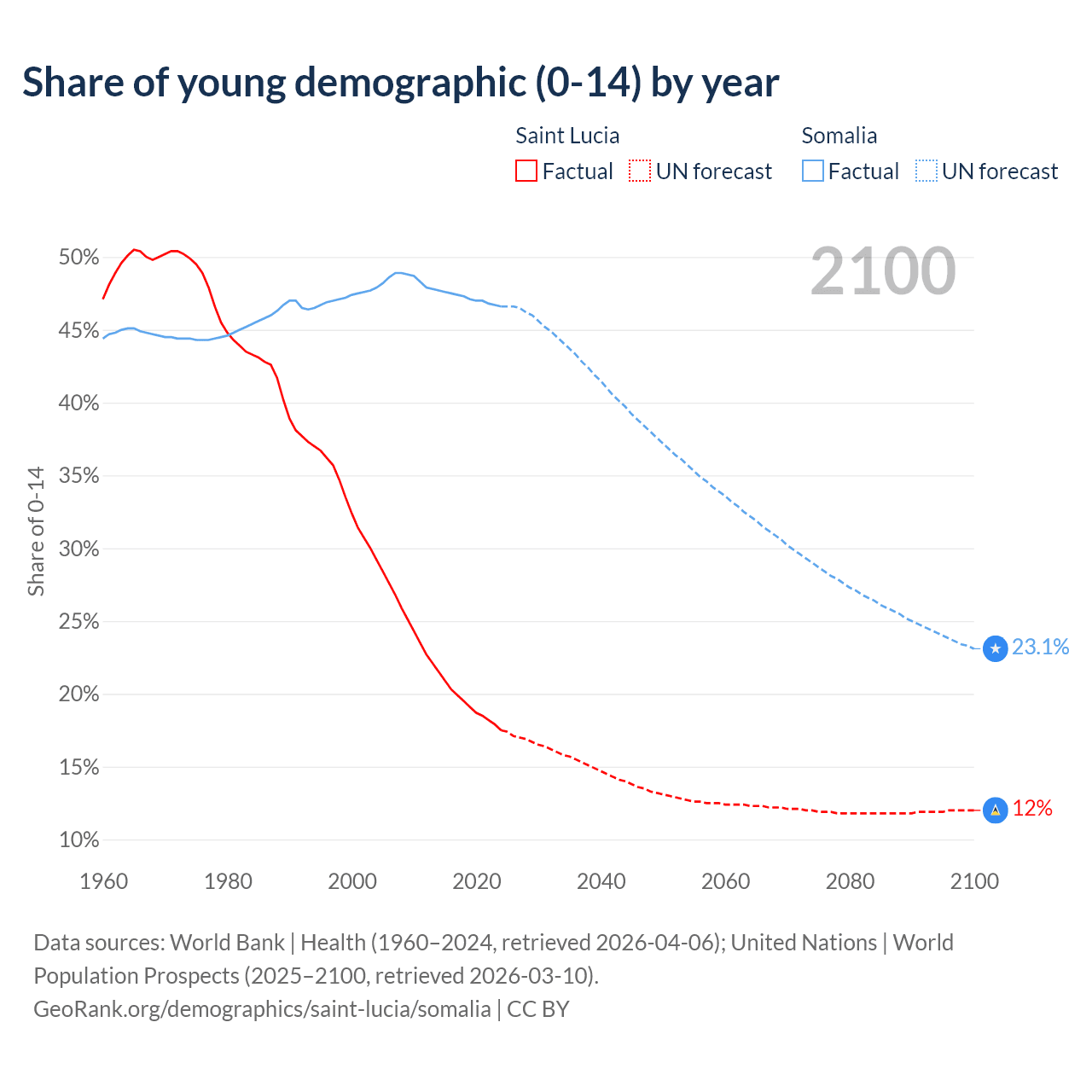 - The share of young demographic (0-15 years old) in Saint Lucia is 17.5% vs 46.6% in Somalia.