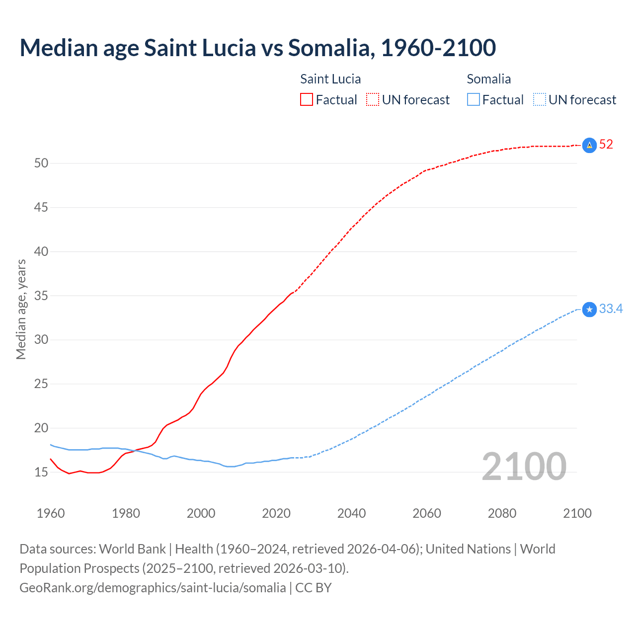 Median age Saint Lucia vs Somalia, 1960-2100