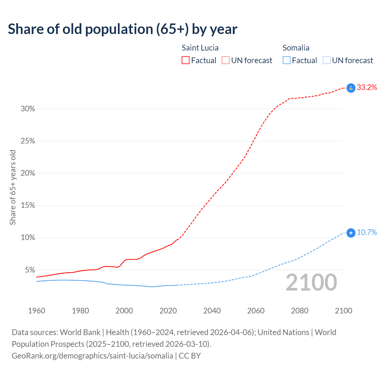 - The share of old-age demographic (65+) in Saint Lucia is 9.62% vs 2.59% in Somalia.
