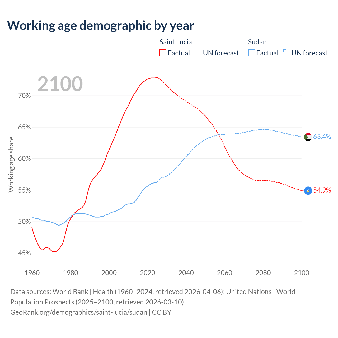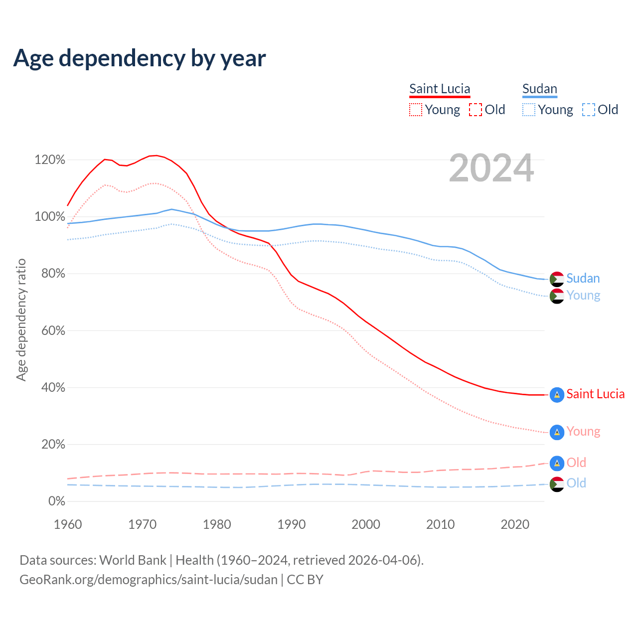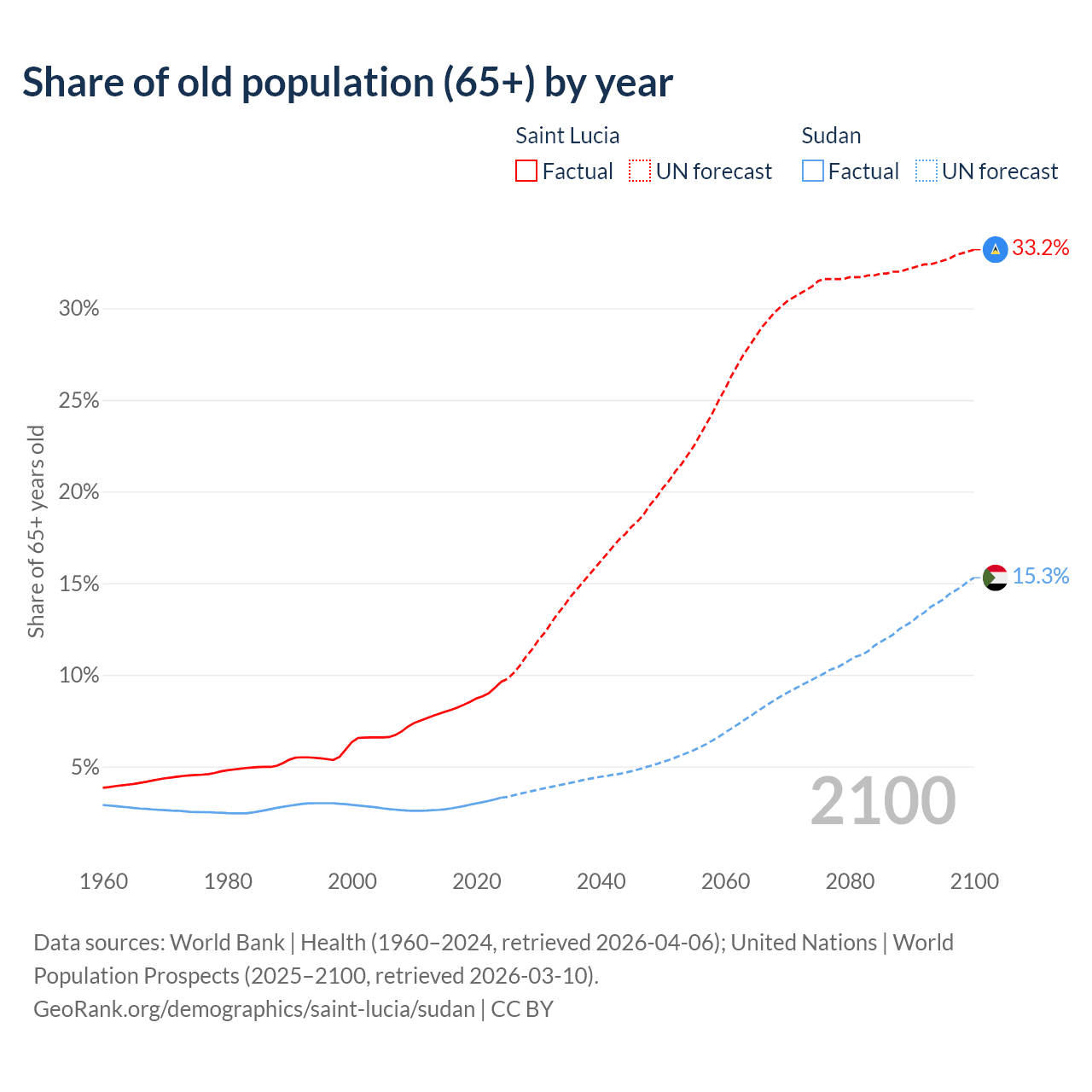 - The share of old-age demographic (65+) in Saint Lucia is 9.62% vs 3.3% in Sudan.