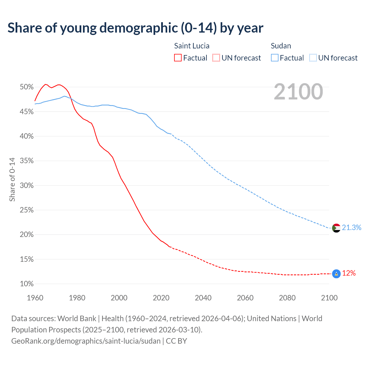 - The share of young demographic (0-15 years old) in Saint Lucia is 17.5% vs 40.5% in Sudan.