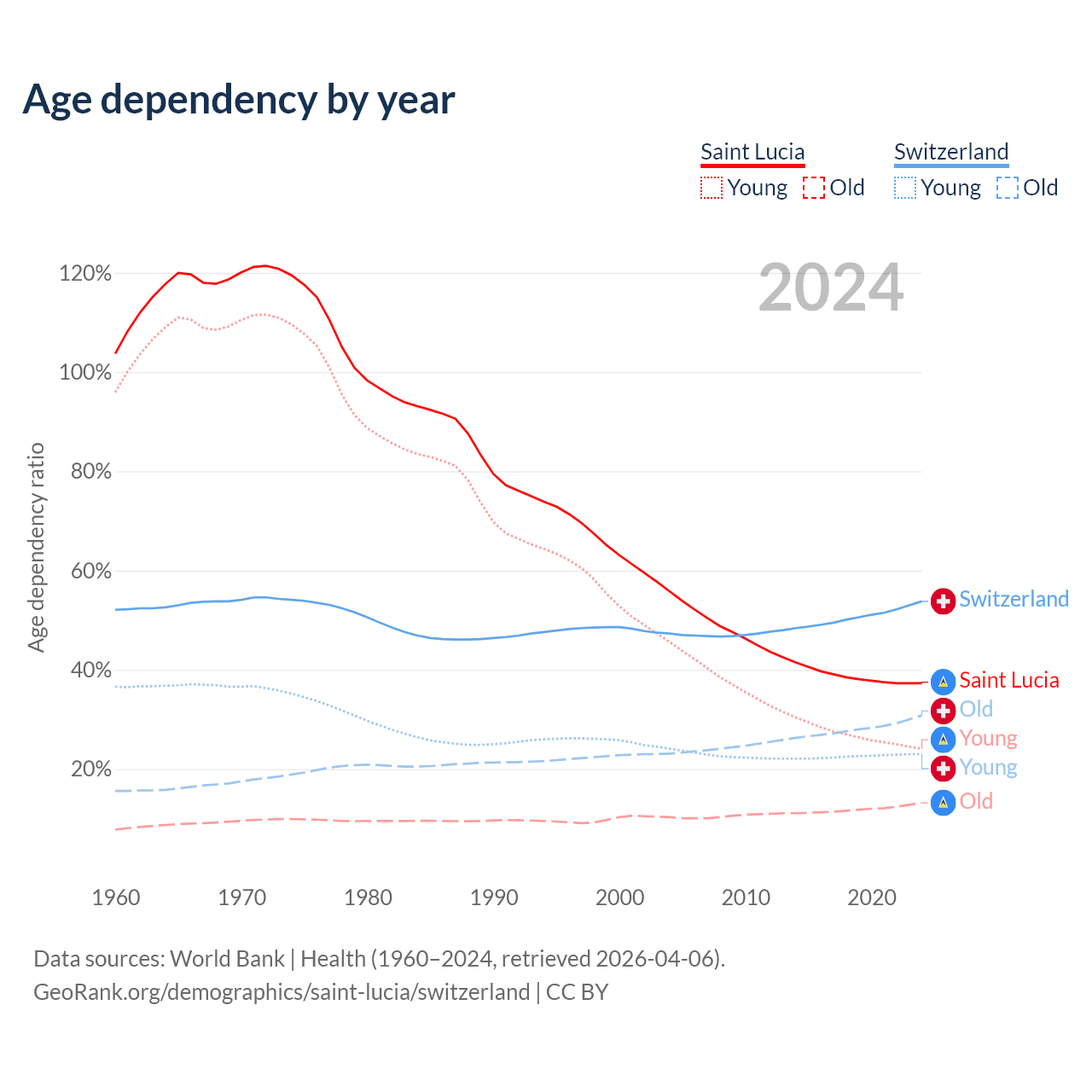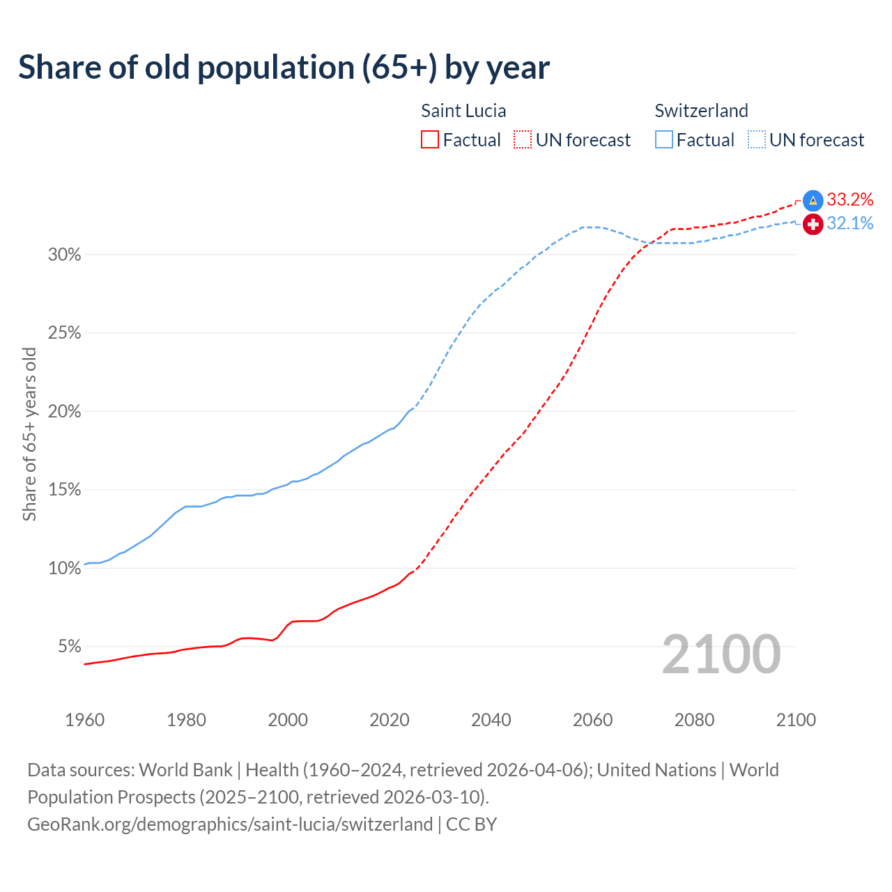 The share of older people aged 65 and over is 9.62% in Saint Lucia and 20% in Switzerland. Life expectancy in Saint Lucia compared to Switzerland .