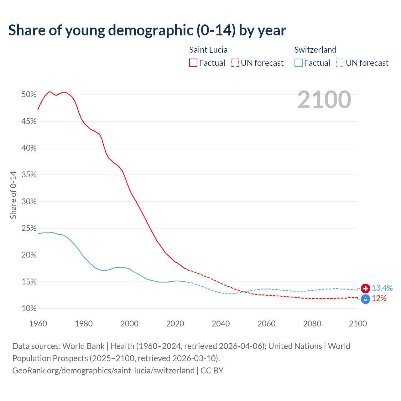 - The share of young demographic (0-15 years old) in Saint Lucia is 17.5% vs 15% in Switzerland.