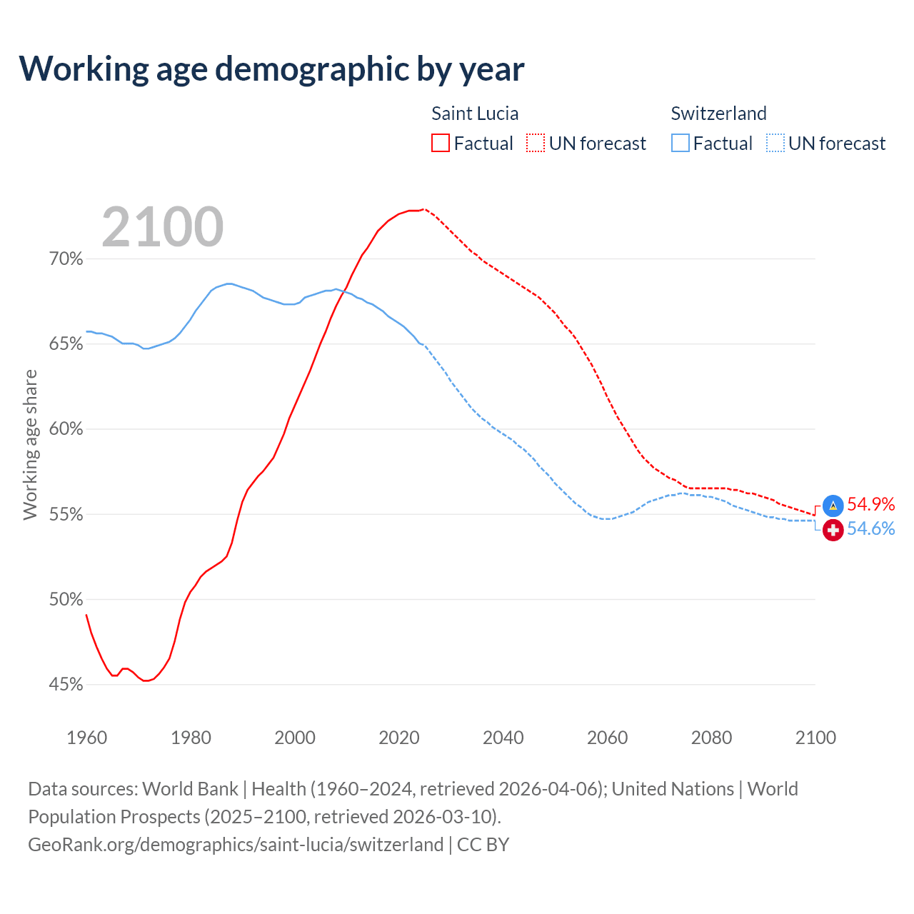 - Saint Lucia has 132K working age adults (aged 15-64) vs 5.92M in Switzerland.