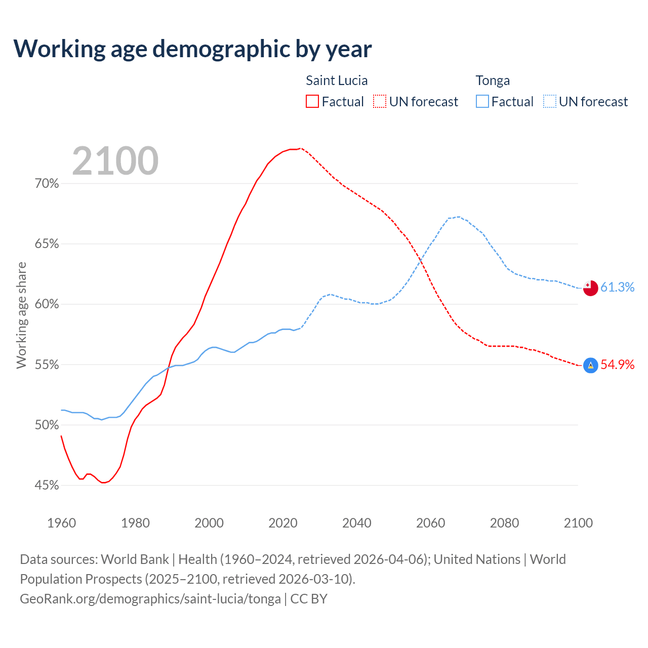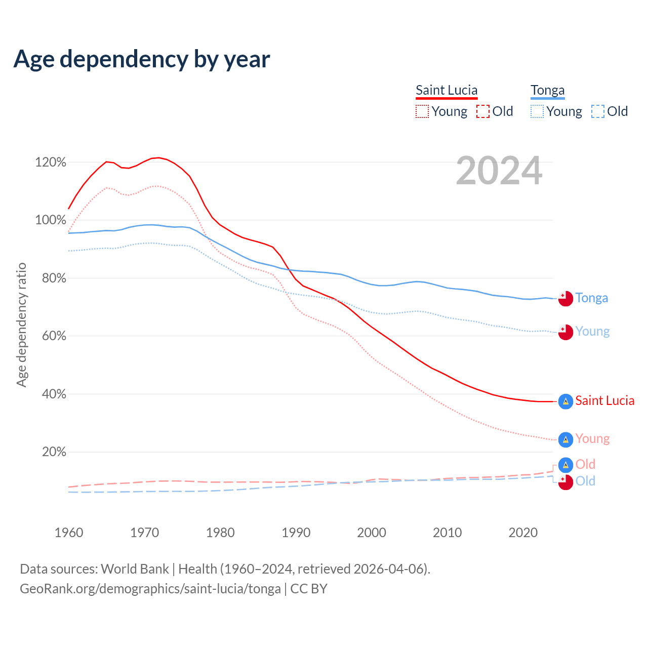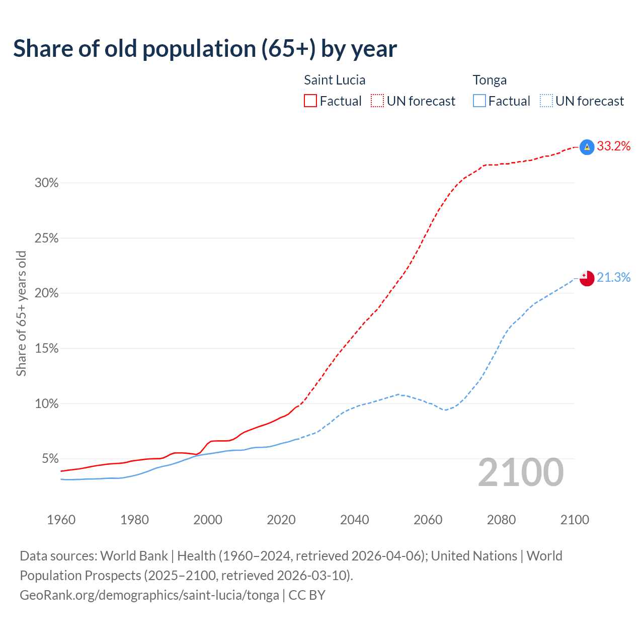 - The share of old-age demographic (65+) in Saint Lucia is 9.62% vs 6.72% in Tonga.
