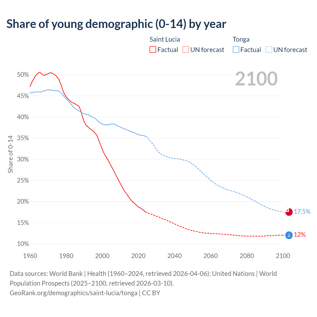 - The share of young demographic (0-15 years old) in Saint Lucia is 17.5% vs 35.4% in Tonga.