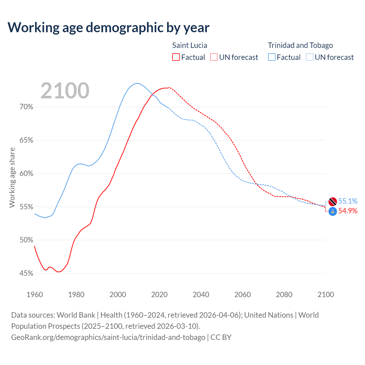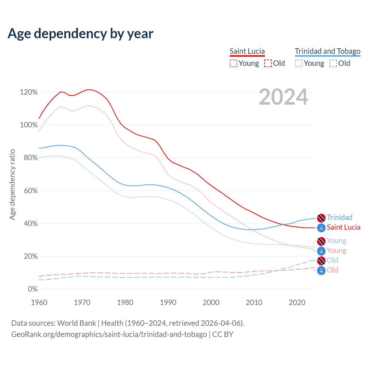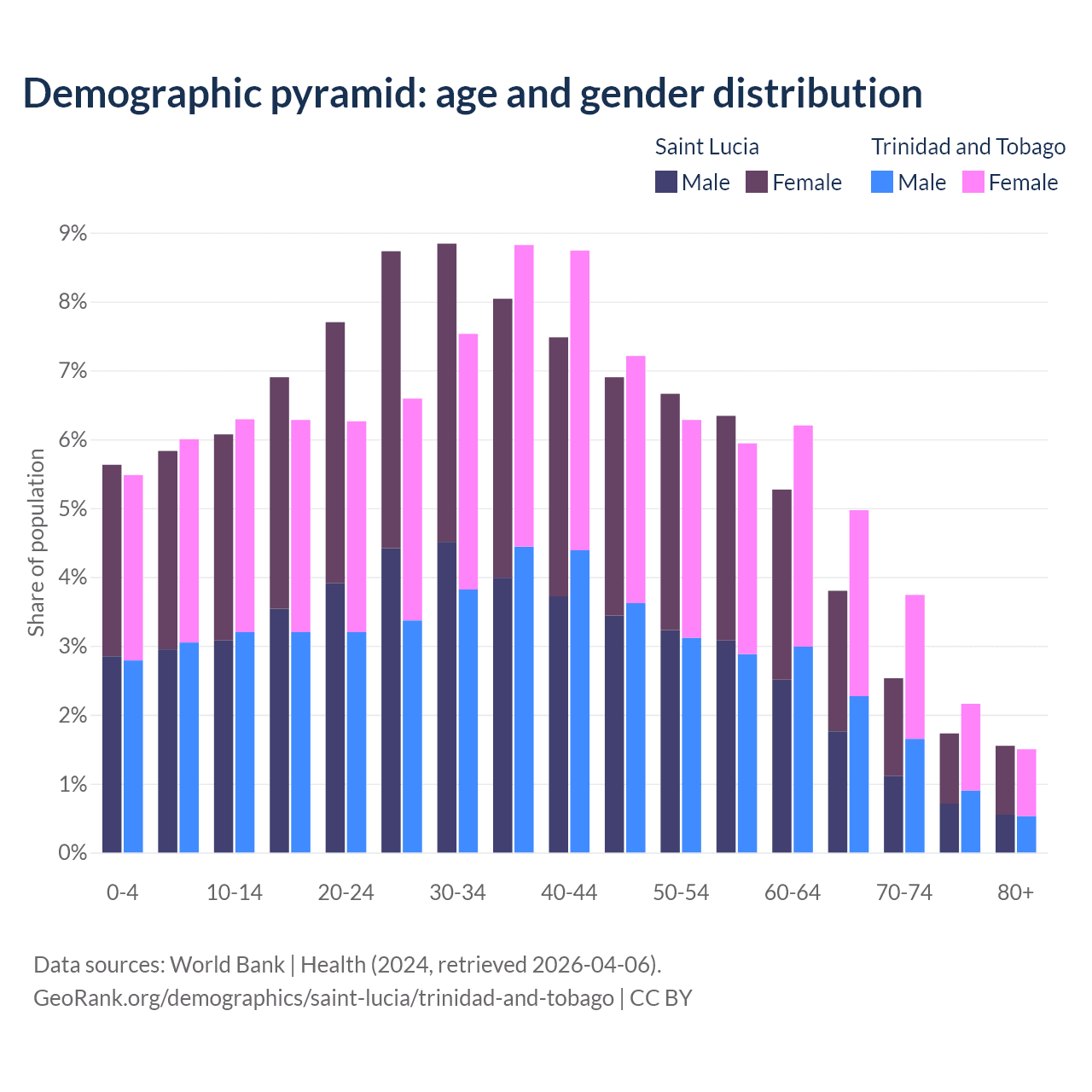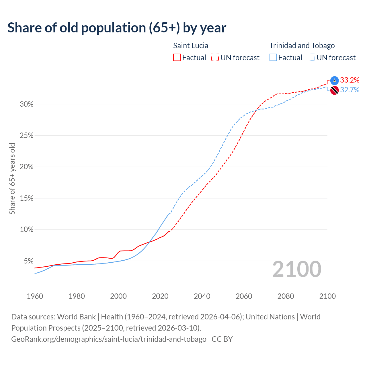 The share of older people aged 65 and over is 9.62% in Saint Lucia and 12.4% in Trinidad and Tobago. Life expectancy in Saint Lucia compared to Trinidad and Tobago .