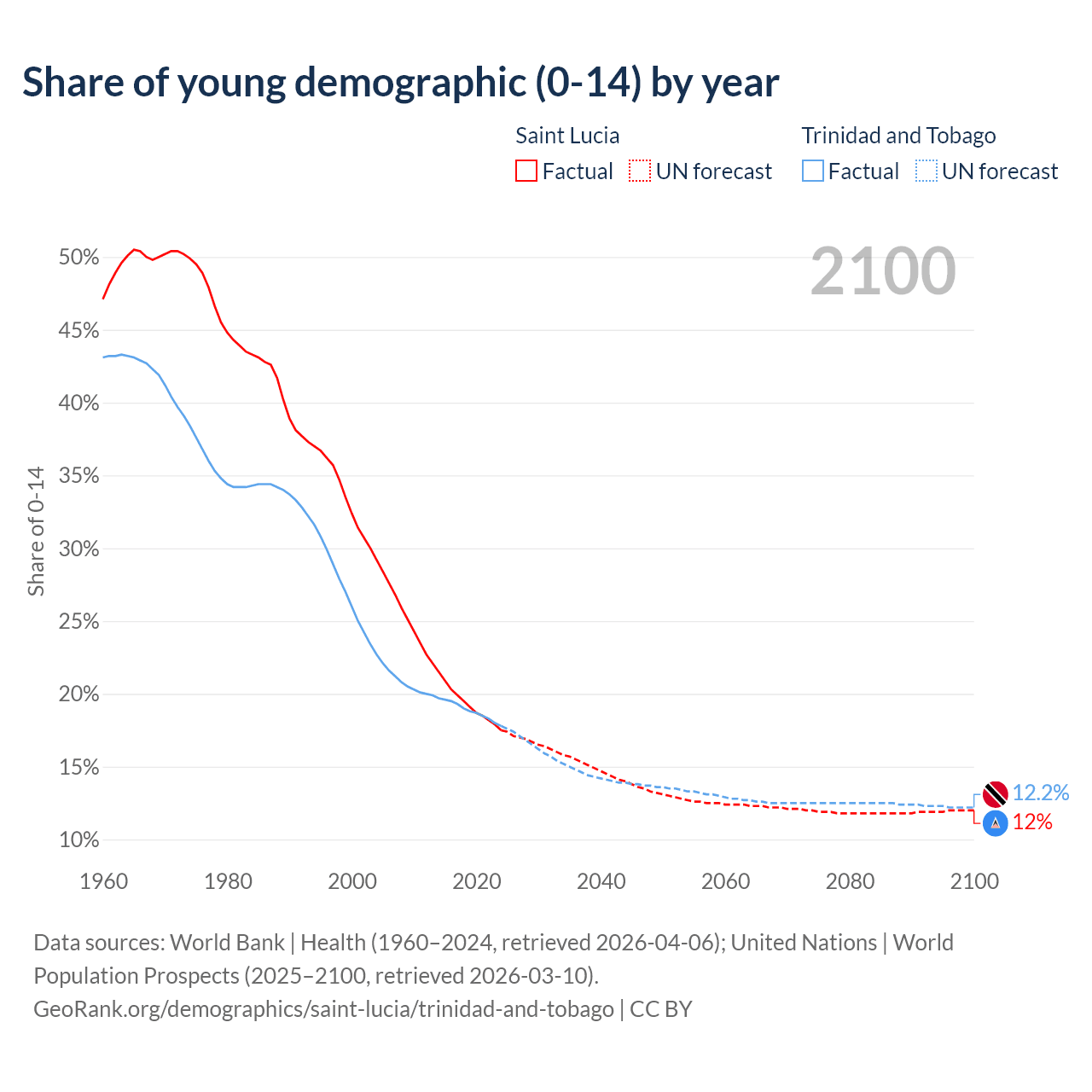 - The share of young demographic (0-15 years old) in Saint Lucia is 17.5% vs 17.8% in Trinidad and Tobago.
