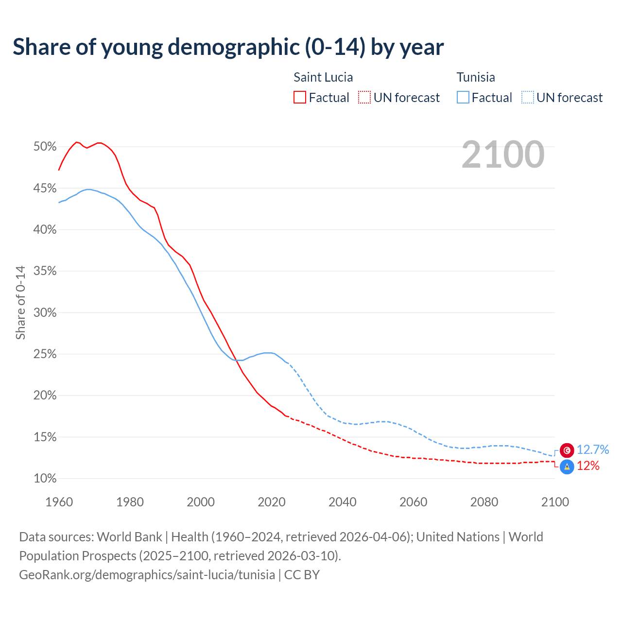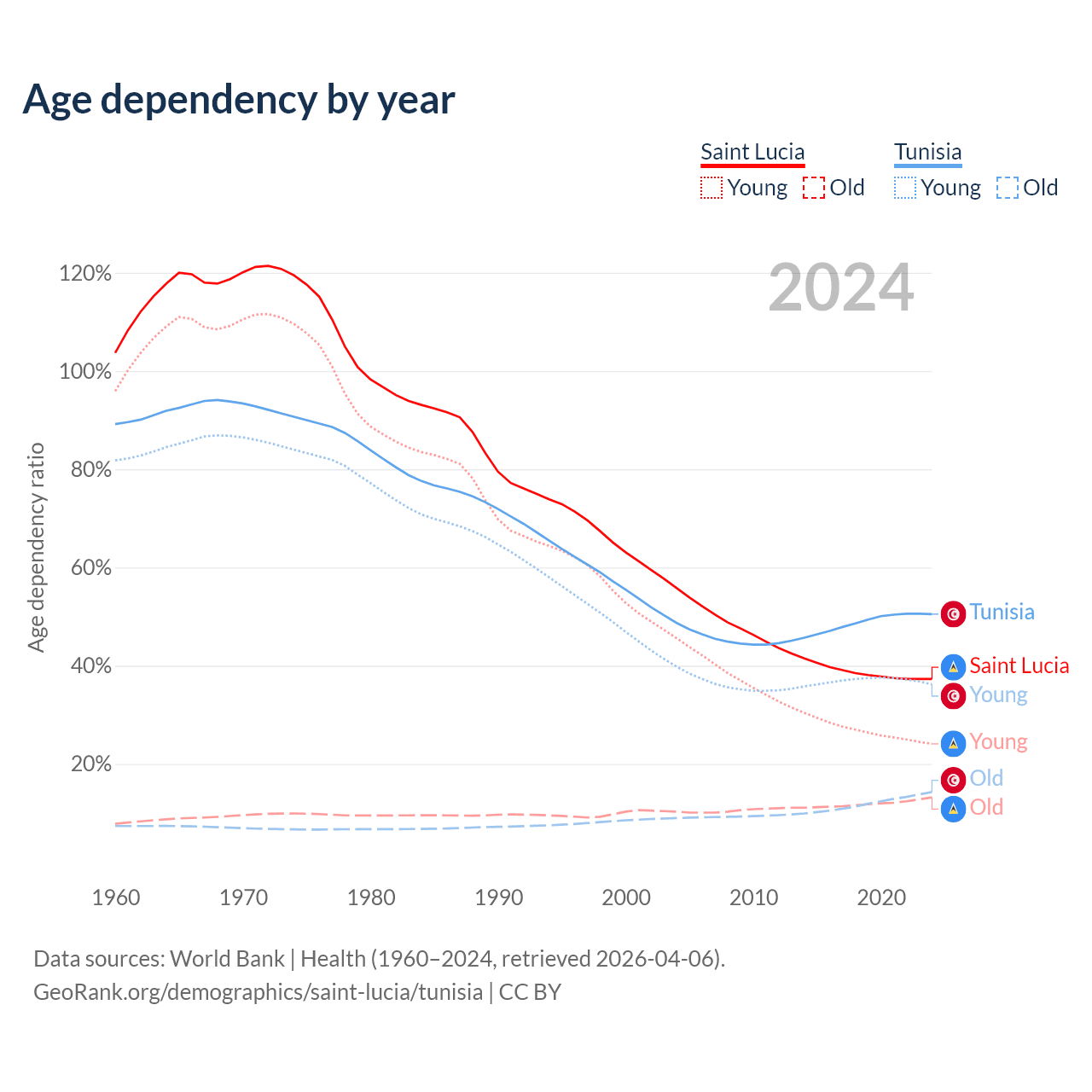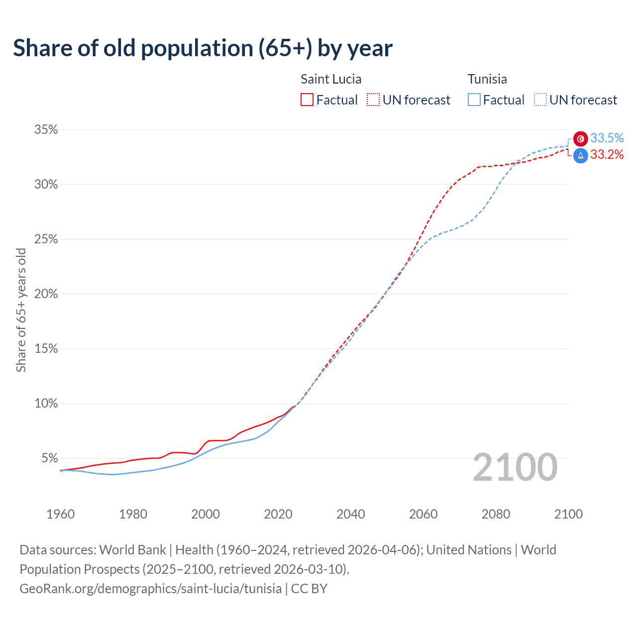 - The share of old-age demographic (65+) in Saint Lucia is 9.62% vs 9.53% in Tunisia.