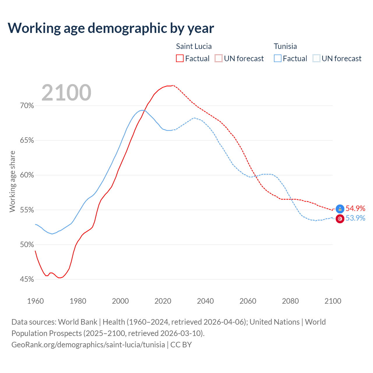 - Saint Lucia has 132K working age adults (aged 15-64) vs 8.26M in Tunisia.