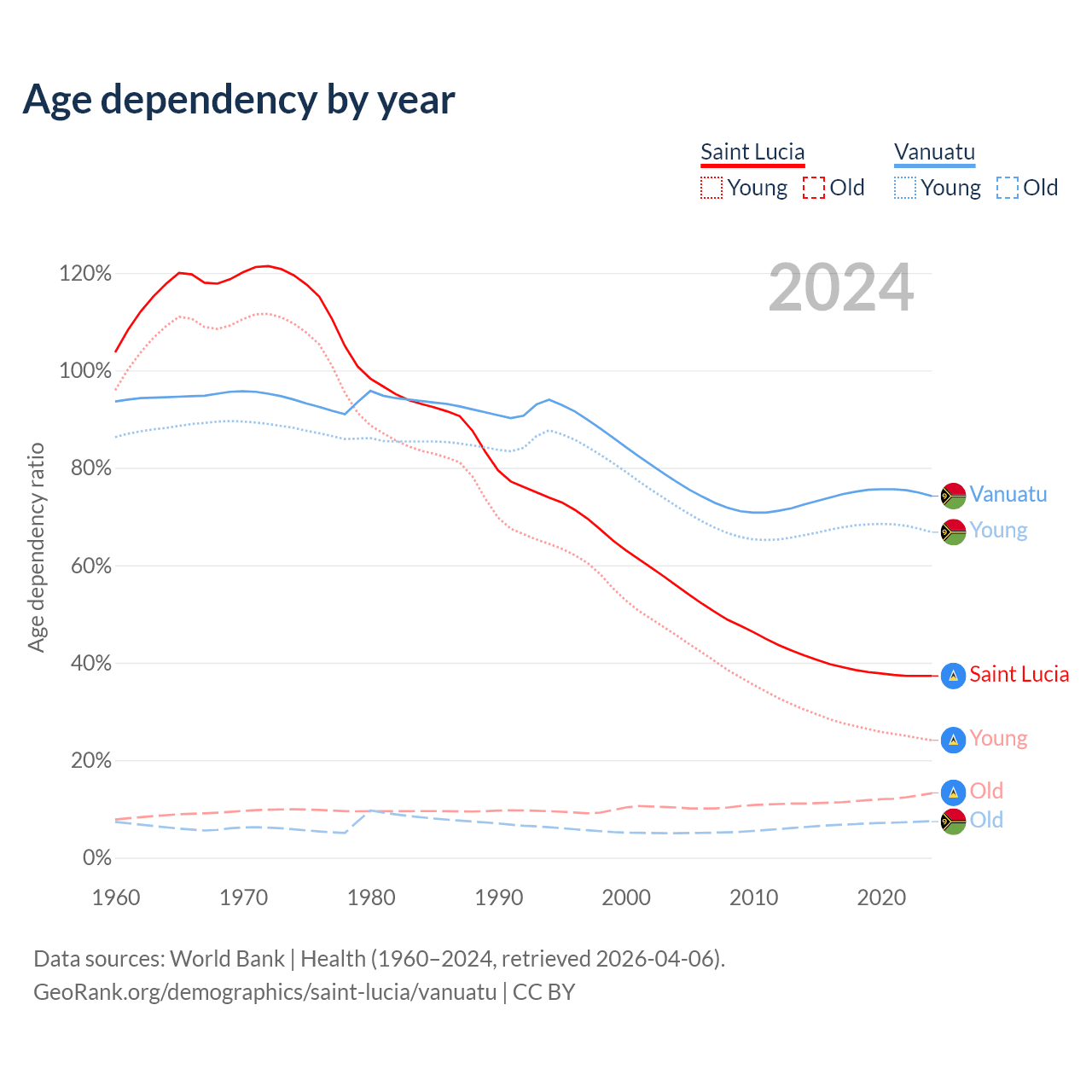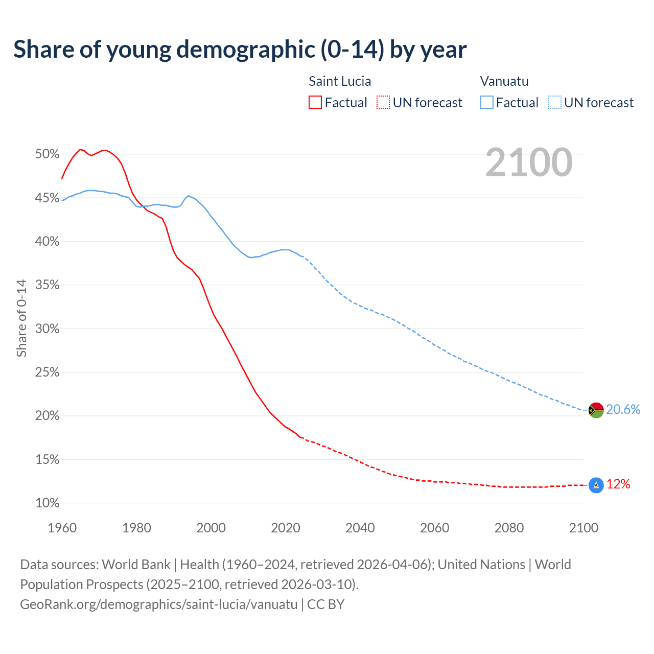 - The share of young demographic (0-15 years old) in Saint Lucia is 17.5% vs 38.3% in Vanuatu.