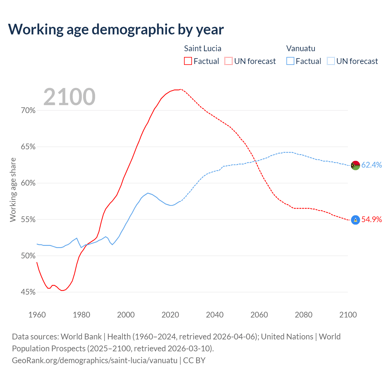 - Saint Lucia has 132K working age adults (aged 15-64) vs 198K in Vanuatu.