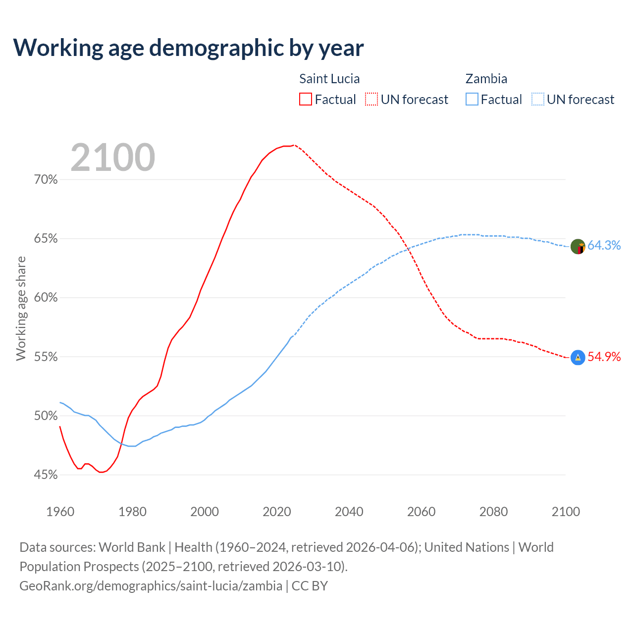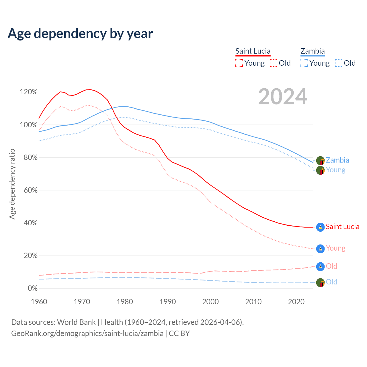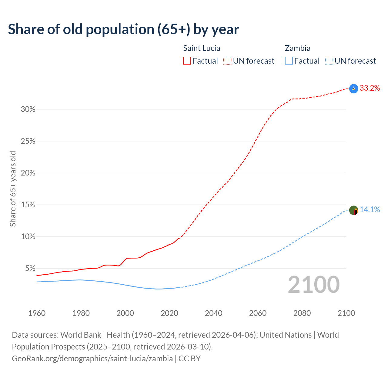 - The share of old-age demographic (65+) in Saint Lucia is 9.62% vs 1.95% in Zambia.