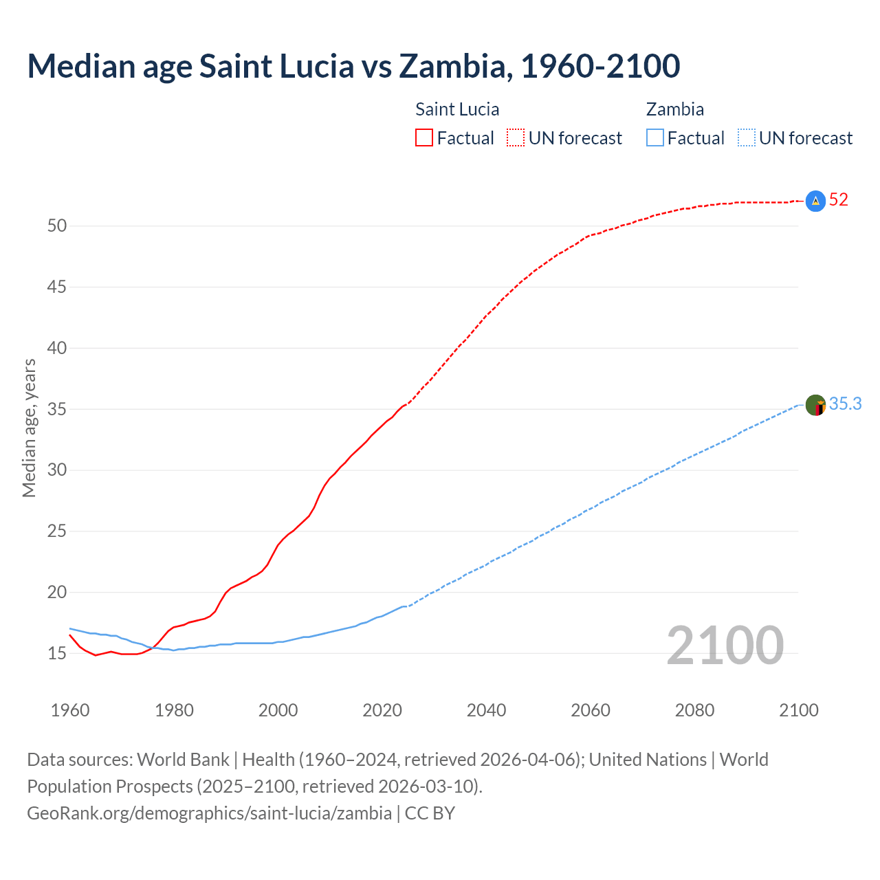 Median age Saint Lucia vs Zambia, 1960-2100