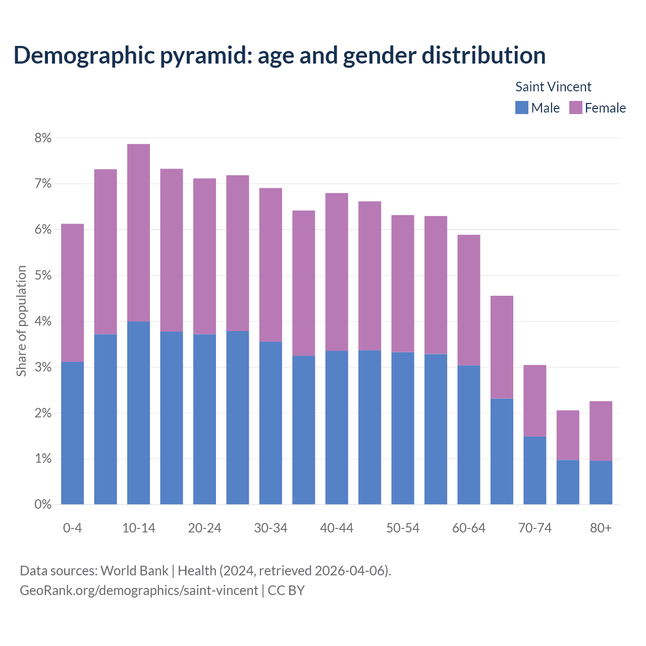 With a population of 101K people, Saint Vincent has a median age of 35.2 years which makes it the 75/196 oldest country. 21.3% of the demographic are children 0-14 years old, 66.8% are working-age people aged 15-64, and 11.9% are older population aged 65+ years.