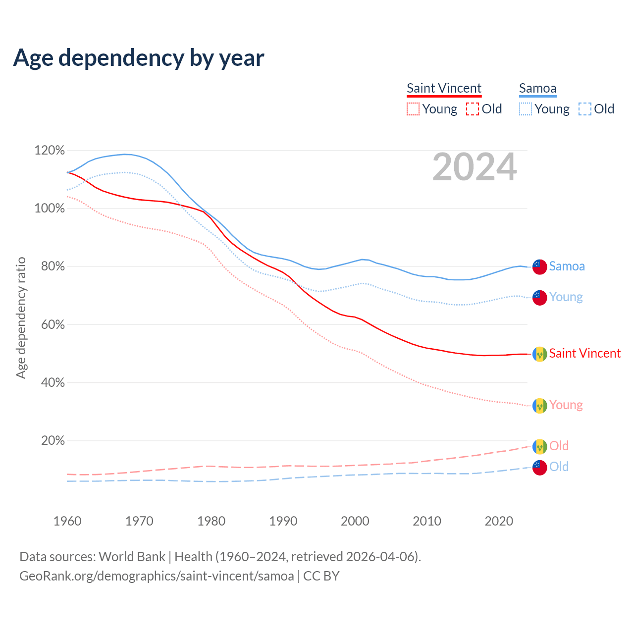 - The share of old-age demographic (65+) in Saint Vincent is 11.9% vs 5.88% in Samoa.