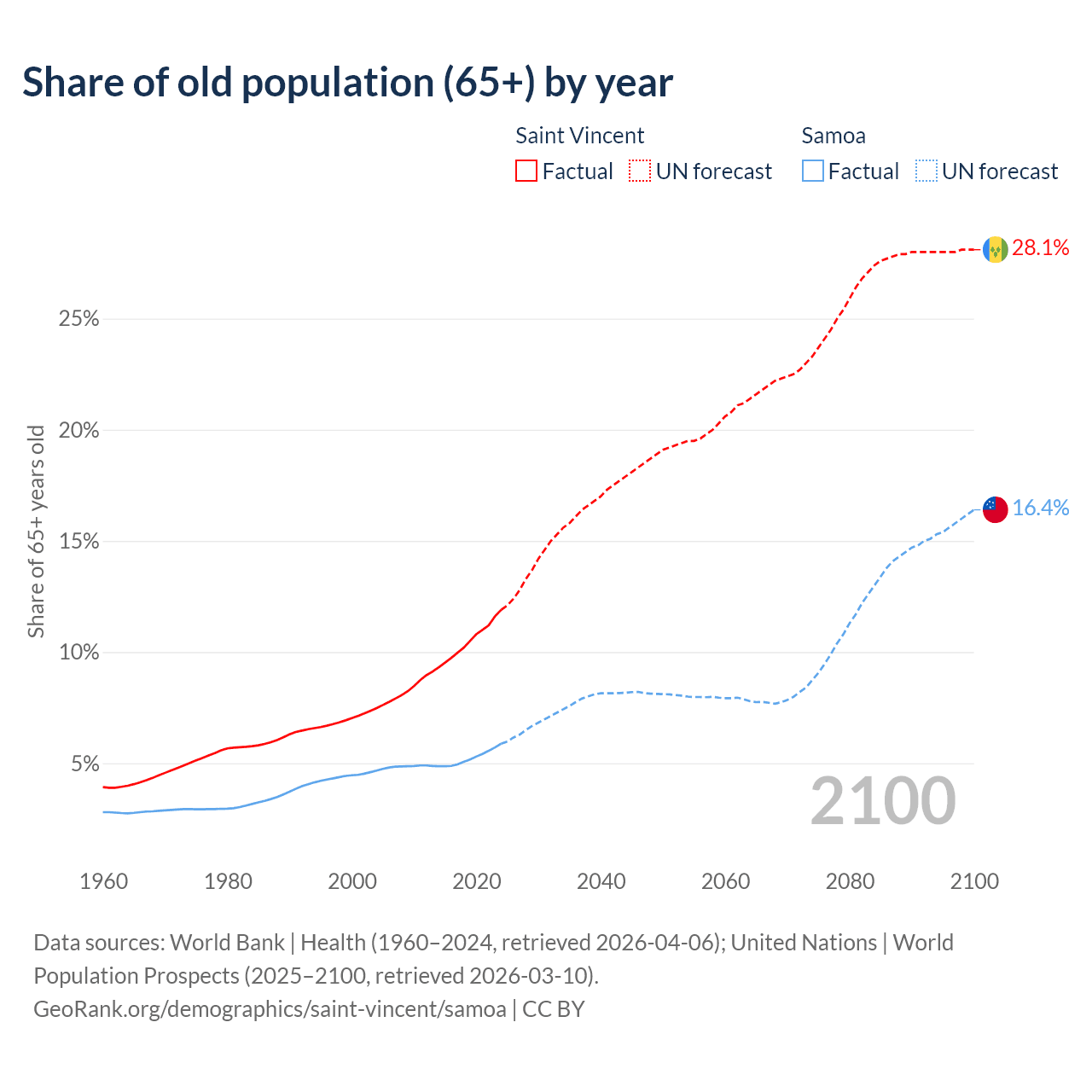 The share of older people aged 65 and over is 11.9% in Saint Vincent and 5.88% in Samoa. Life expectancy in Saint Vincent compared to Samoa .