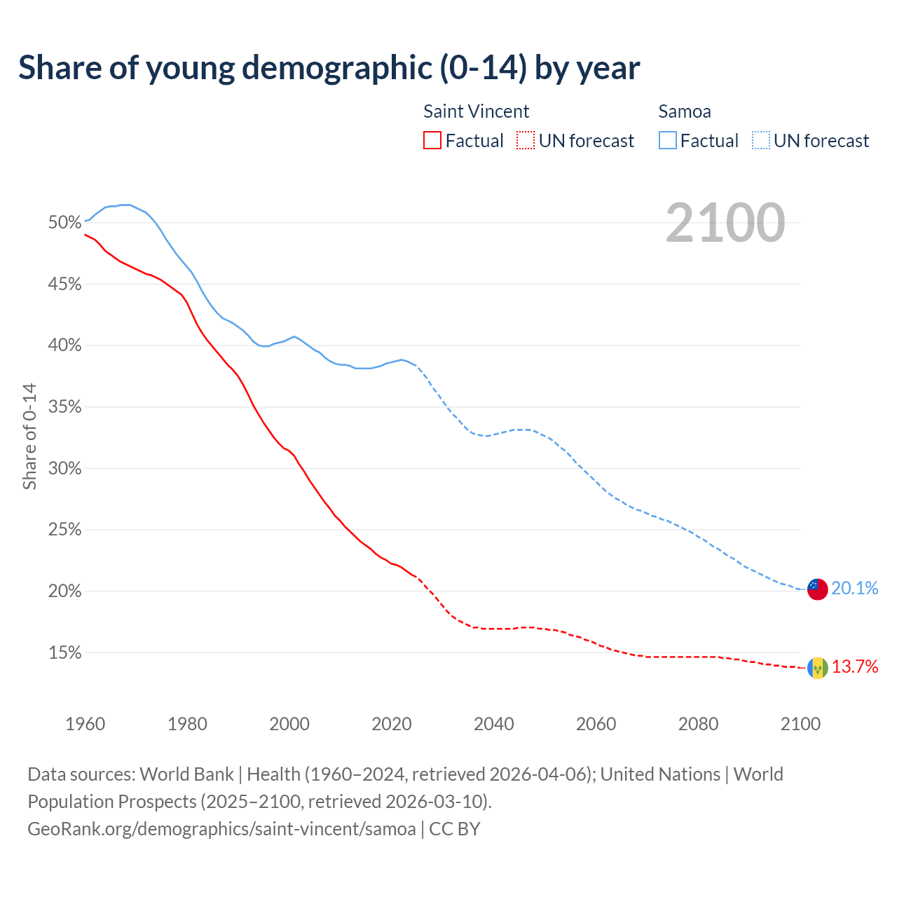 - The share of young demographic (0-15 years old) in Saint Vincent is 21.3% vs 38.5% in Samoa.