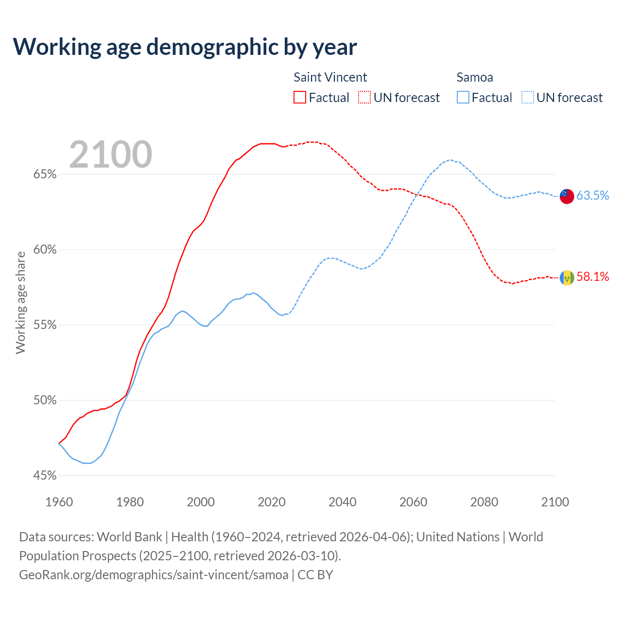 - Saint Vincent has 66.3K working age adults (aged 15-64) vs 123K in Samoa.