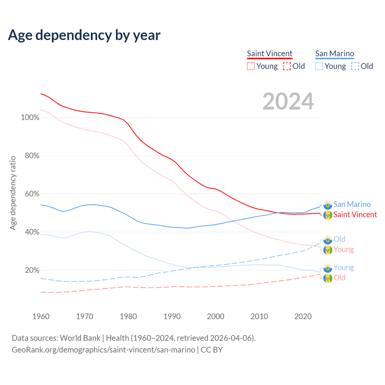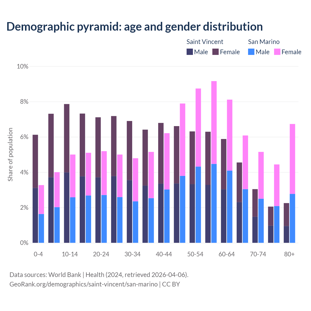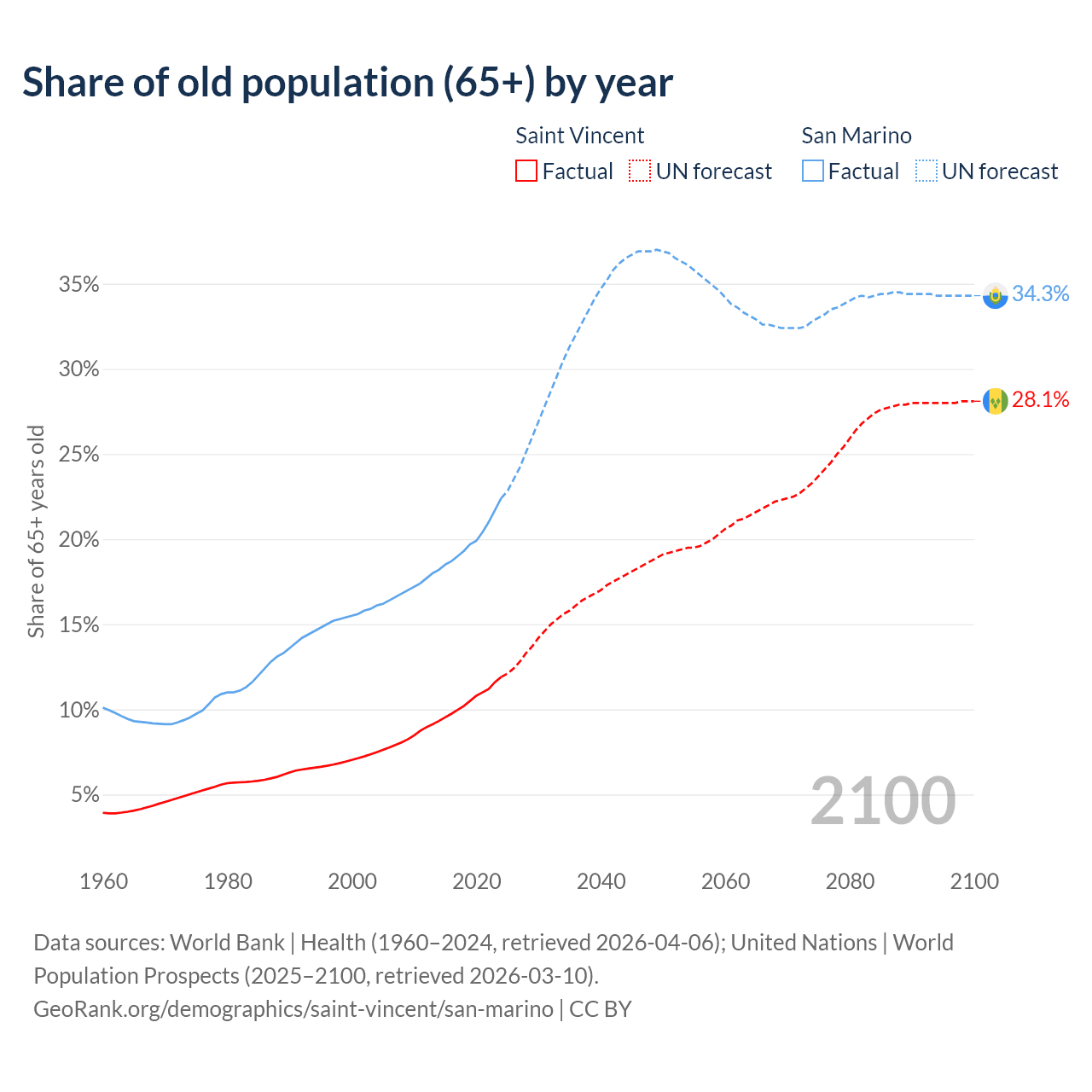 - The share of old-age demographic (65+) in Saint Vincent is 11.9% vs 22.4% in San Marino.
