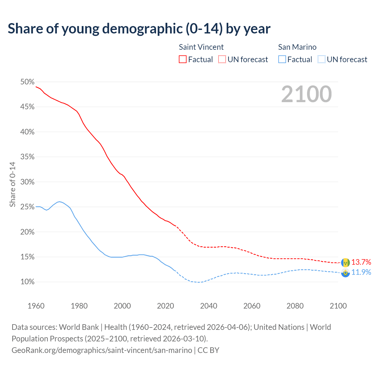 - The share of young demographic (0-15 years old) in Saint Vincent is 21.3% vs 12.3% in San Marino.