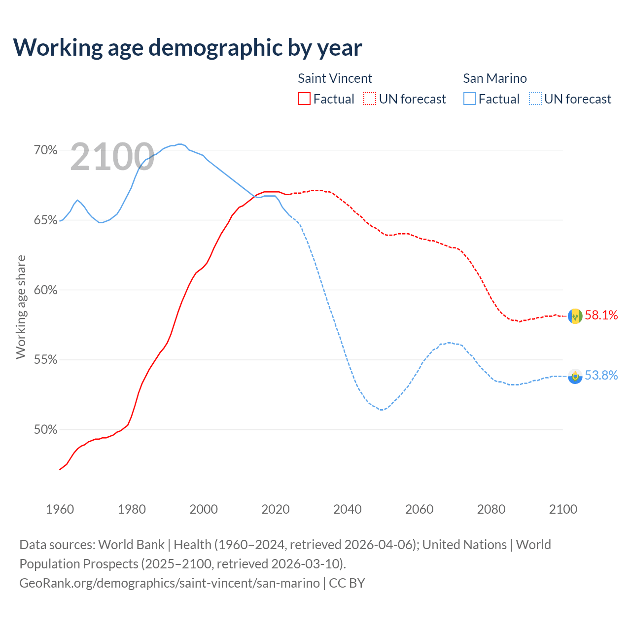 - Saint Vincent has 66.3K working age adults (aged 15-64) vs 22.2K in San Marino.