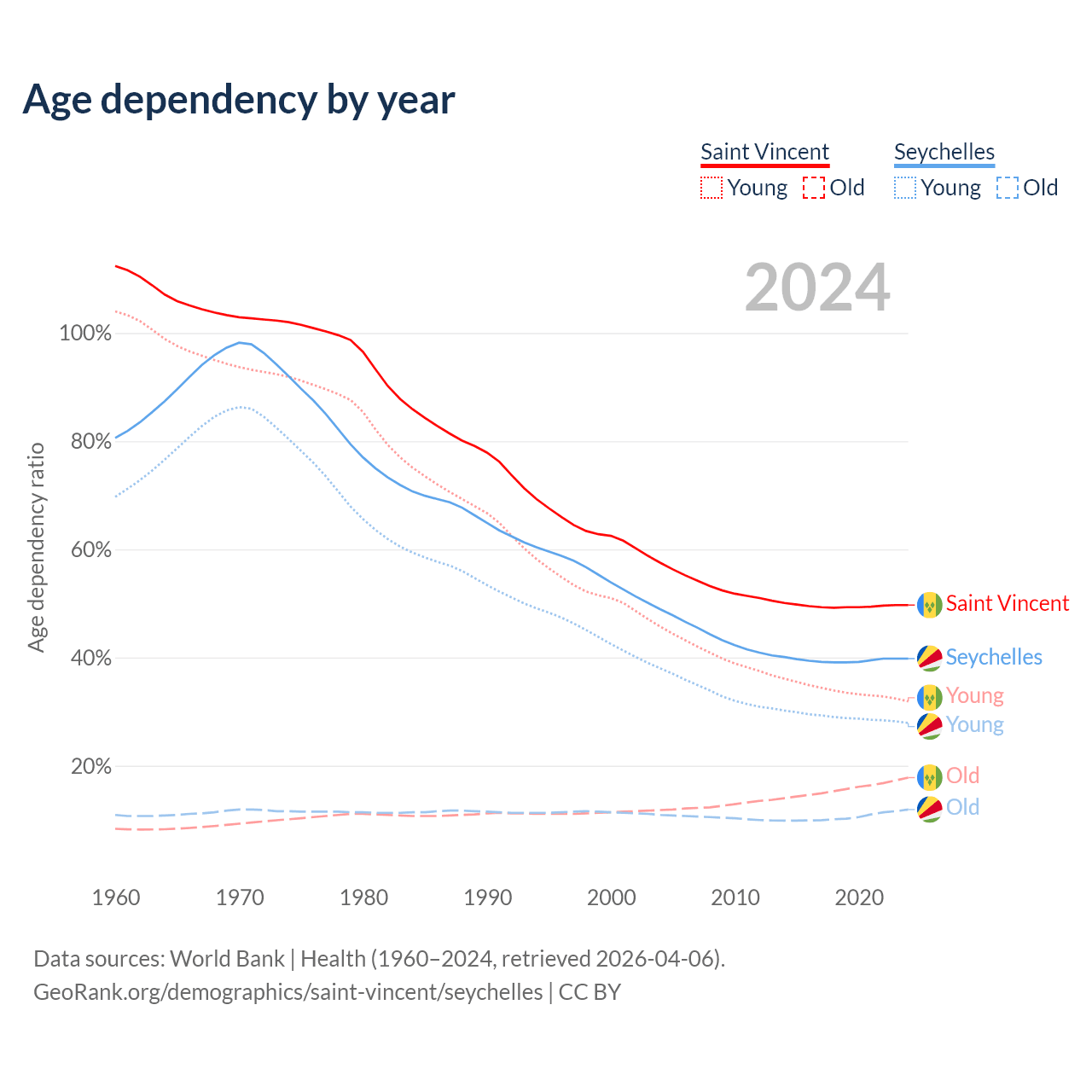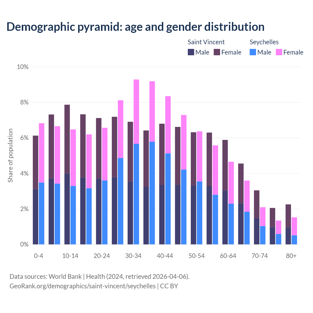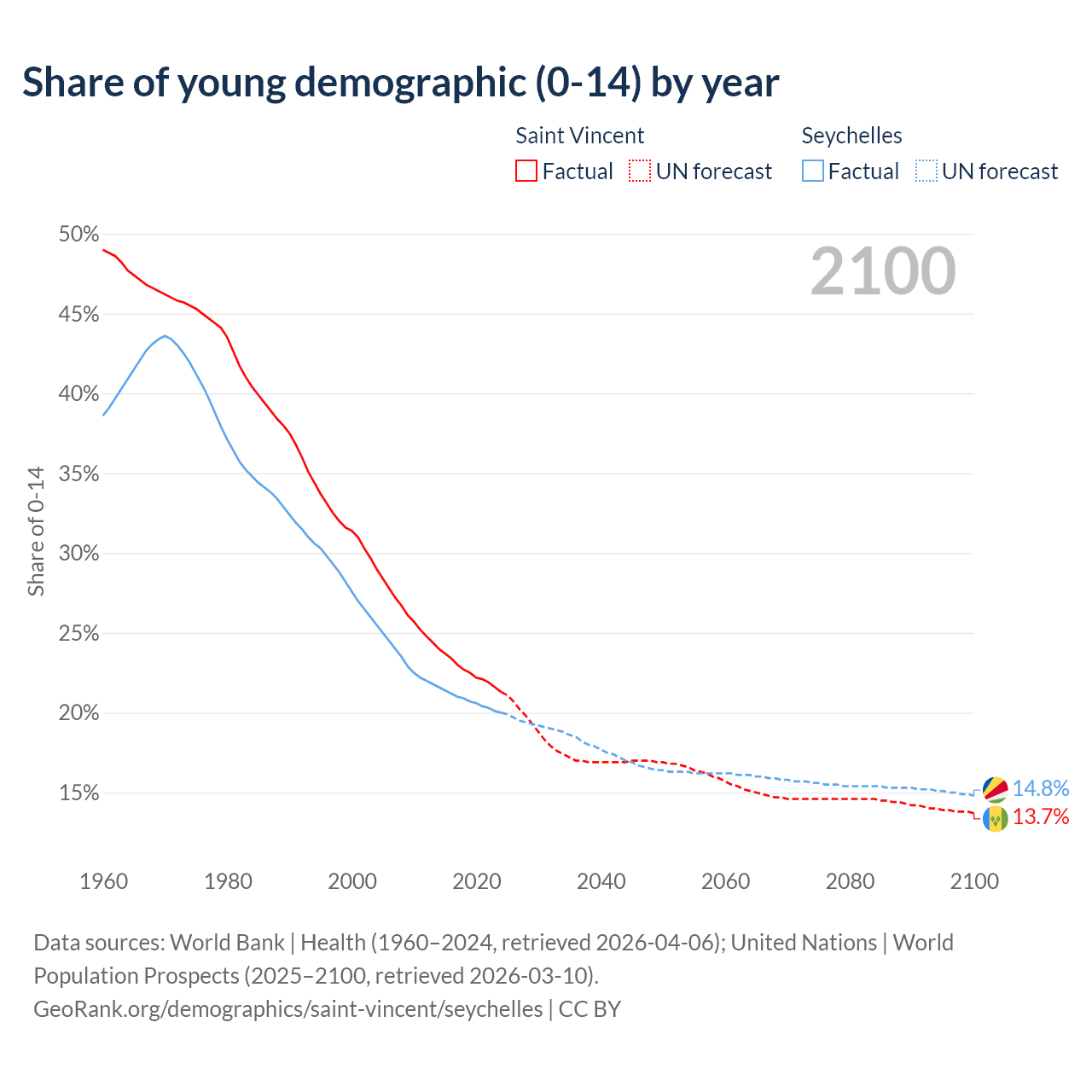 - The share of young demographic (0-15 years old) in Saint Vincent is 21.3% vs 20% in the Seychelles.