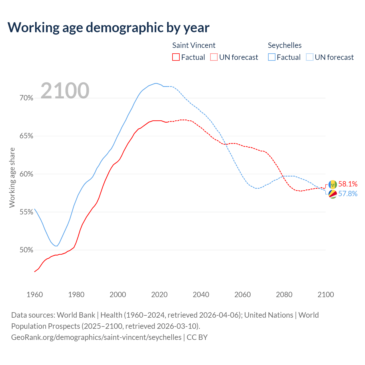 - Saint Vincent has 66.3K working age adults (aged 15-64) vs 90.3K in the Seychelles.