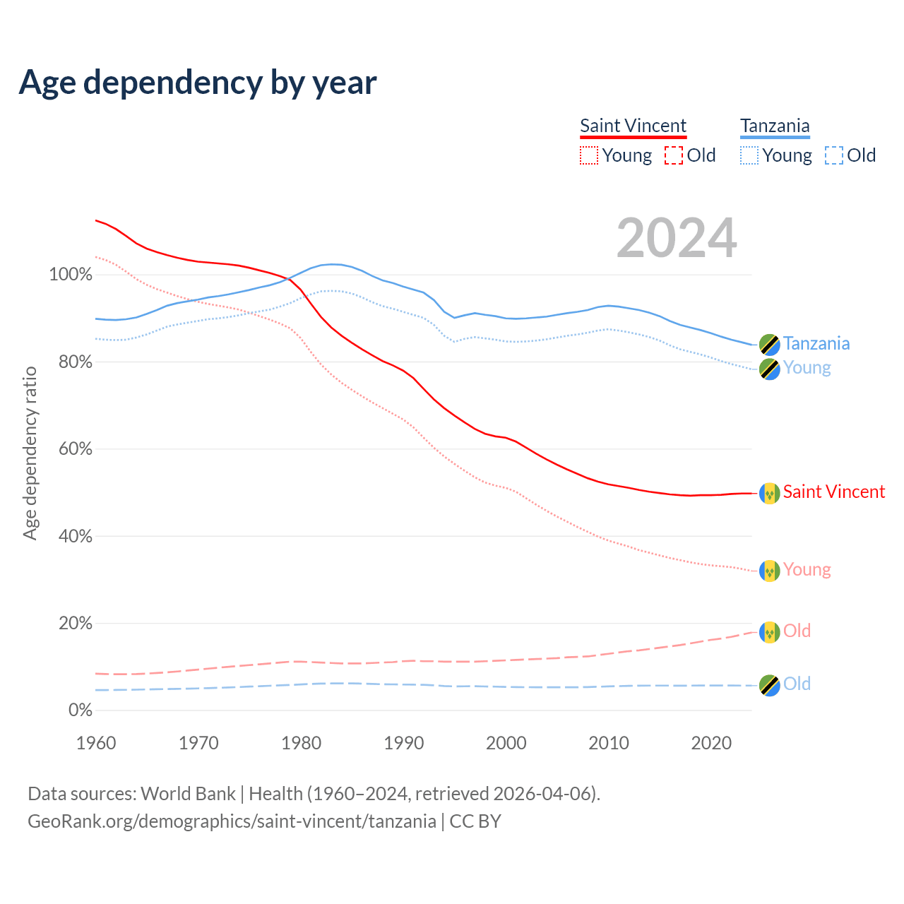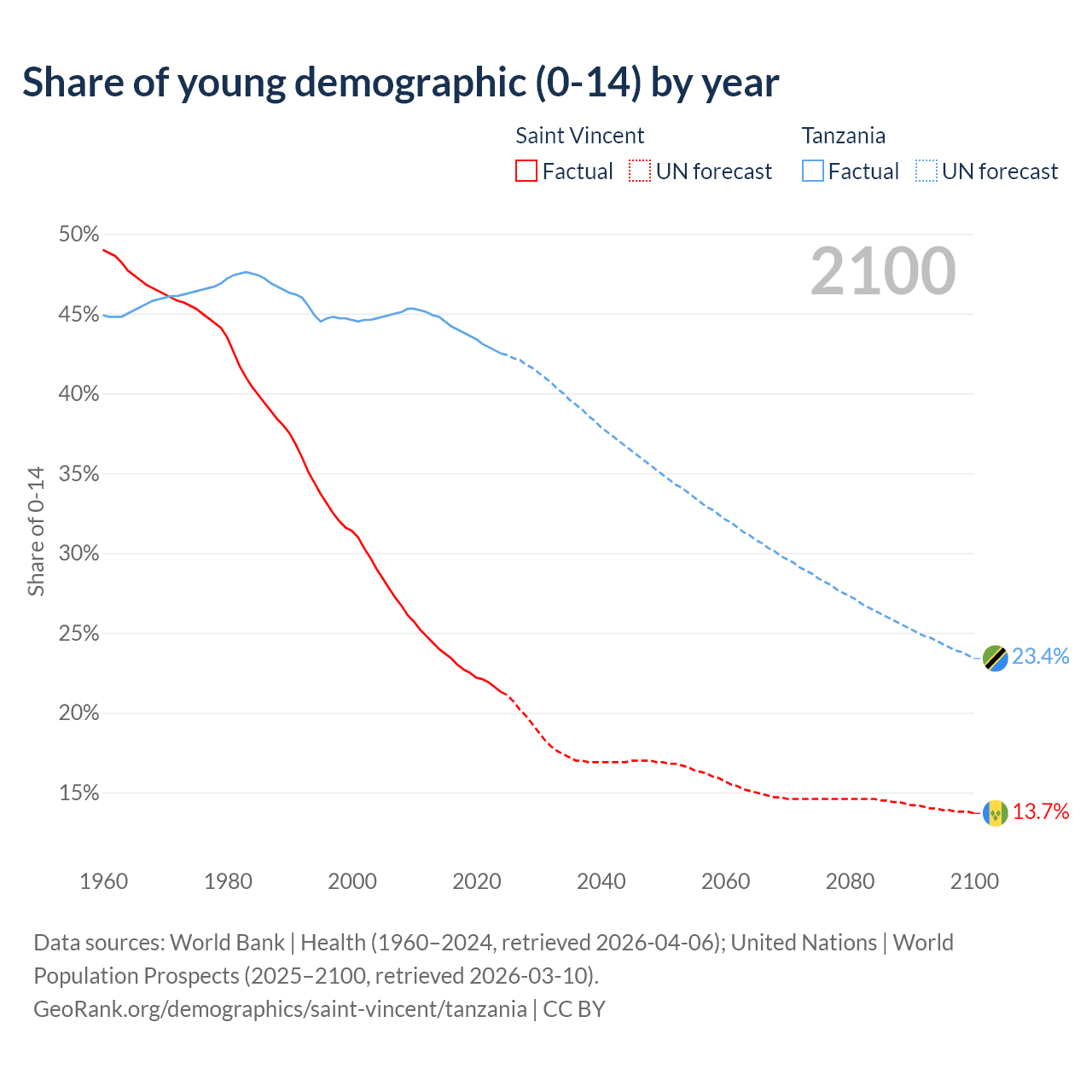 - The share of young demographic (0-15 years old) in Saint Vincent is 21.3% vs 42.5% in Tanzania.