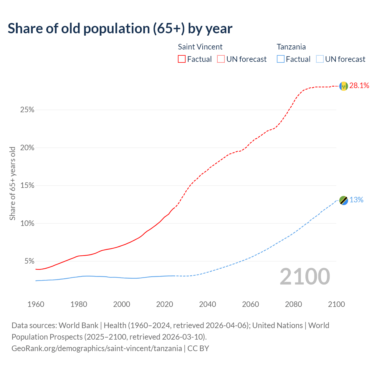 The share of older people aged 65 and over is 11.9% in Saint Vincent and 3.05% in Tanzania. Life expectancy in Saint Vincent compared to Tanzania .