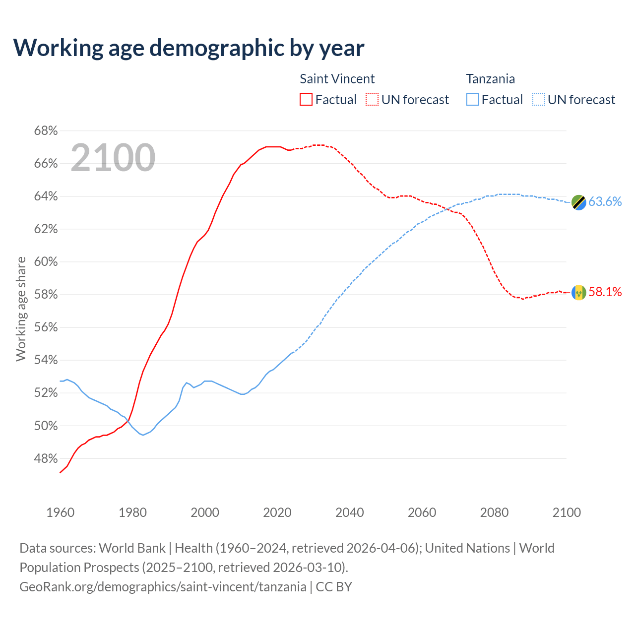 - Saint Vincent has 66.3K working age adults (aged 15-64) vs 39.8M in Tanzania.