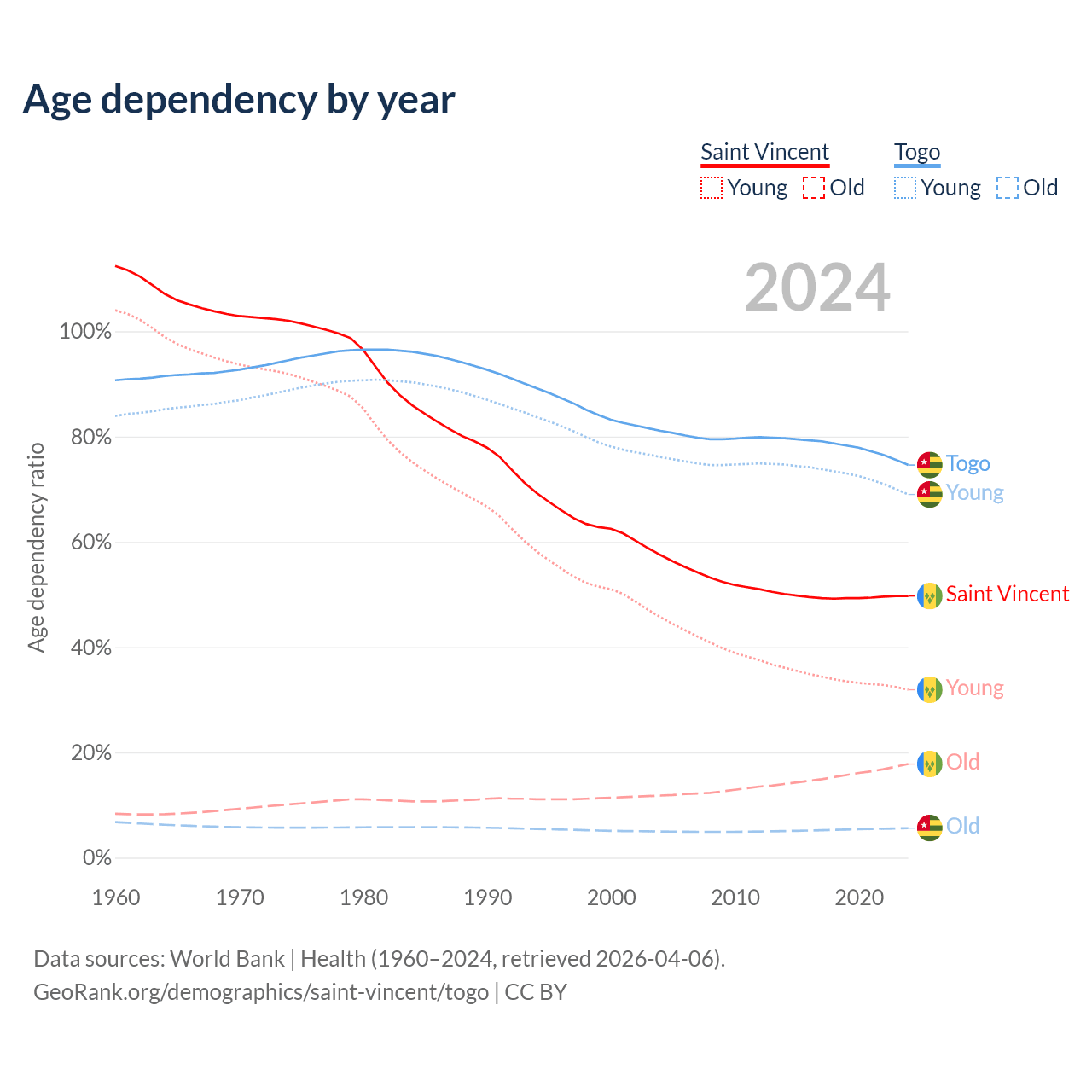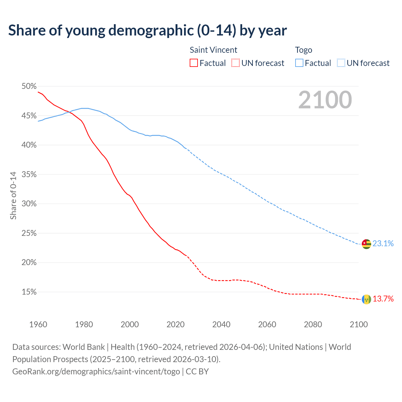 - The share of young demographic (0-15 years old) in Saint Vincent is 21.3% vs 39.5% in Togo.