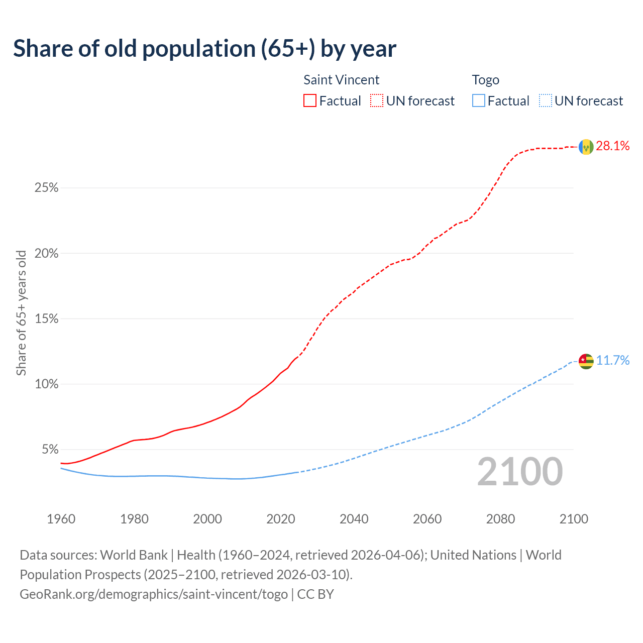 - The share of old-age demographic (65+) in Saint Vincent is 11.9% vs 3.21% in Togo.