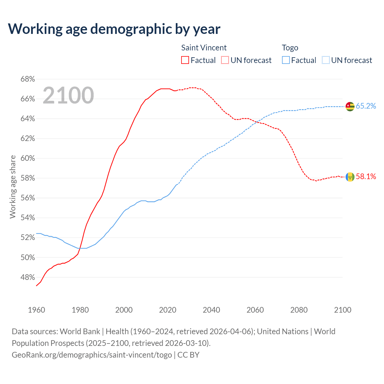 - Saint Vincent has 66.3K working age adults (aged 15-64) vs 5.72M in Togo.