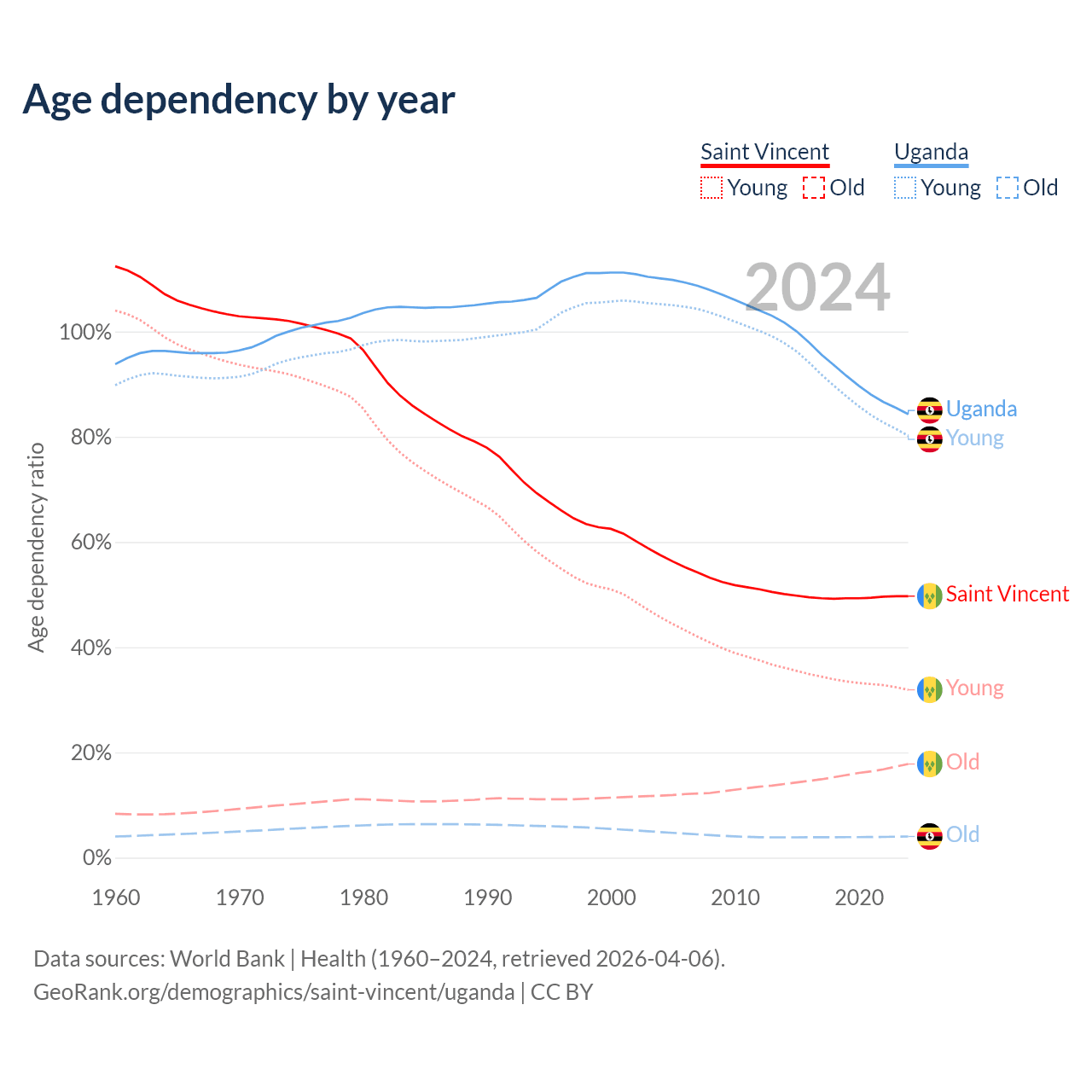 - The share of old-age demographic (65+) in Saint Vincent is 11.9% vs 2.19% in Uganda.
