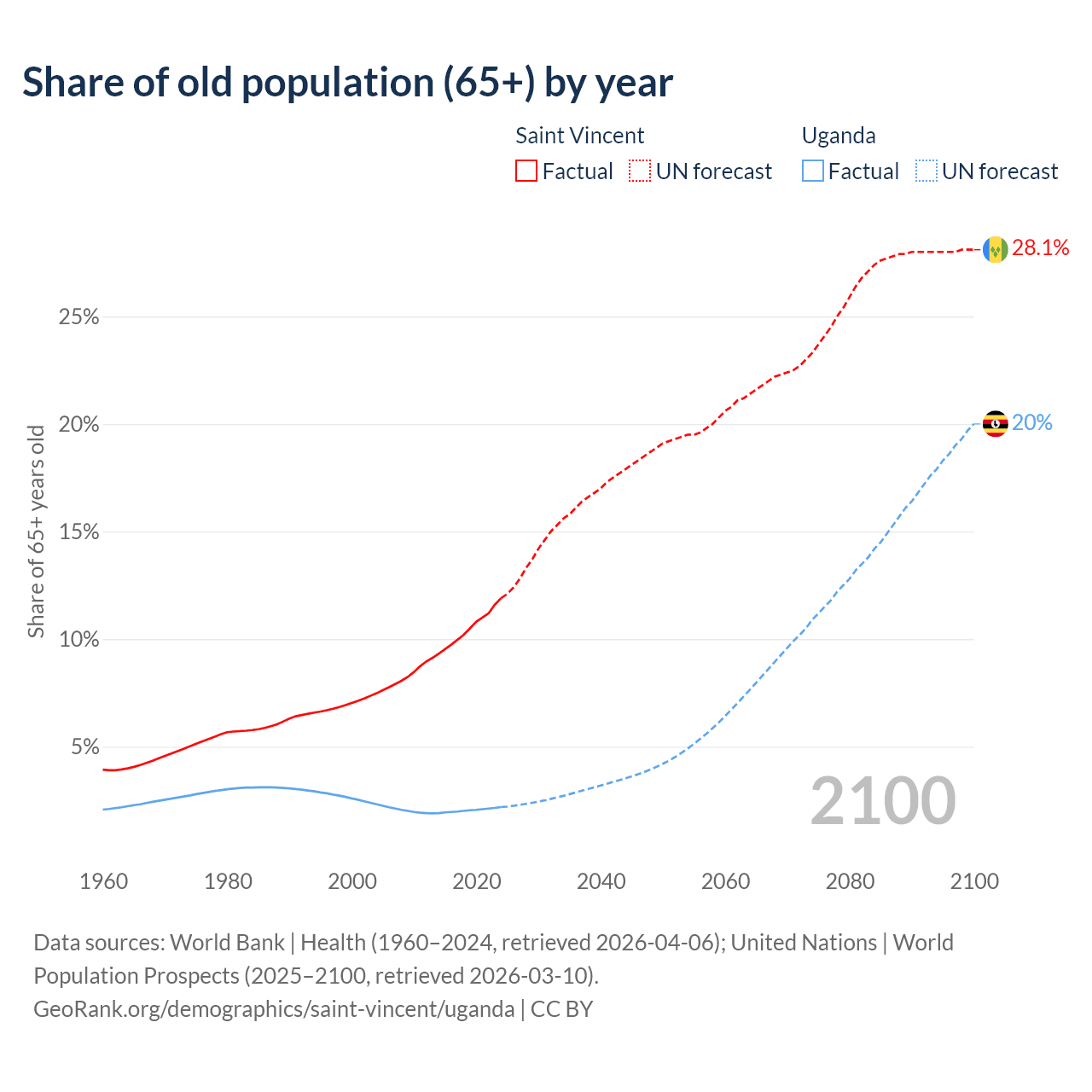 The share of older people aged 65 and over is 11.9% in Saint Vincent and 2.19% in Uganda. Life expectancy in Saint Vincent compared to Uganda .