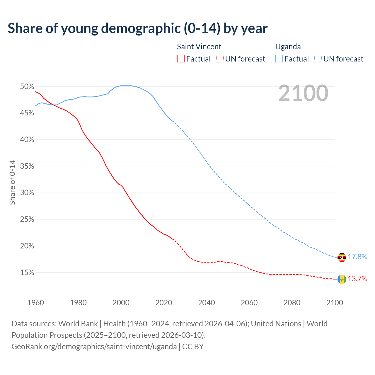 - The share of young demographic (0-15 years old) in Saint Vincent is 21.3% vs 43.5% in Uganda.