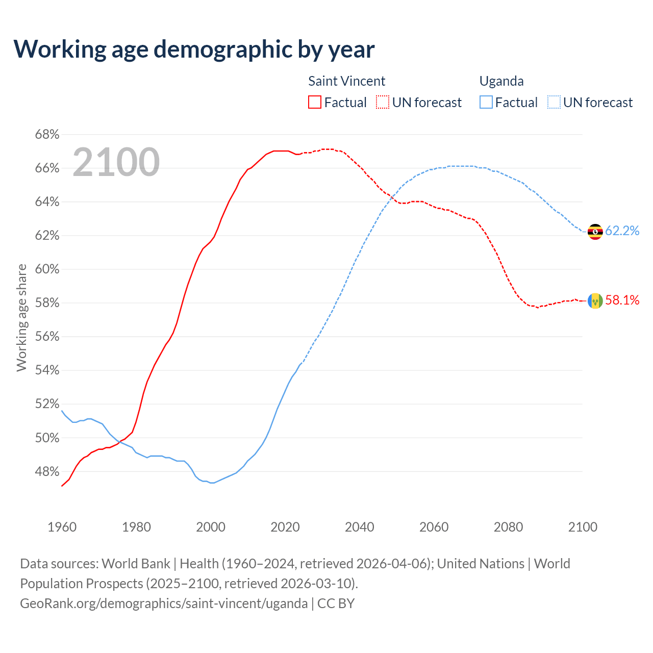 - Saint Vincent has 66.3K working age adults (aged 15-64) vs 28.9M in Uganda.